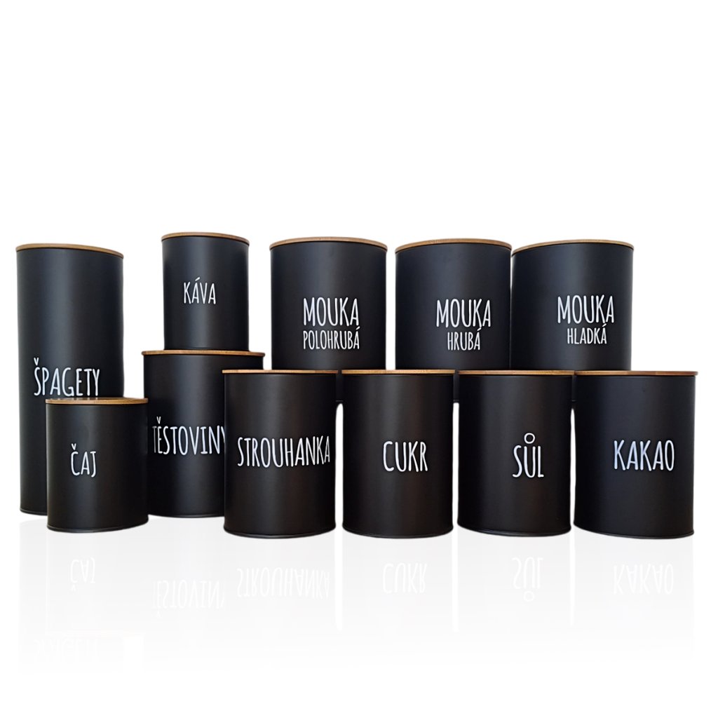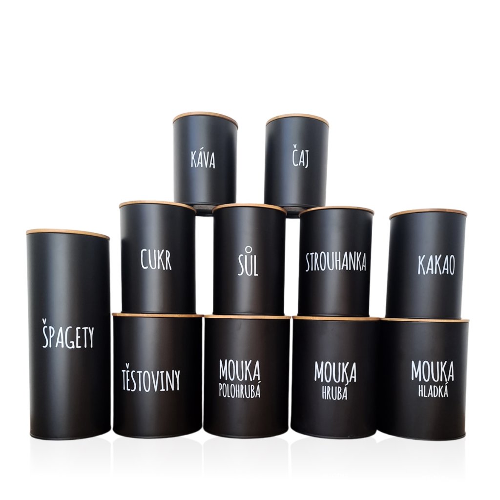 Táto kovová dóza s bambusovým tesniacim viečkom je ideálna na uloženie celého balenia sypkých potravín, ako je napríklad múka, soľ, cukor alebo káva. Vďaka modernému a praktickému dizajnu v guľatom čiernom prevedení s českým bielym nápisom sa stane ozdobou každej kuchyne. Bambusové veko s tesniacim silikónovým krúžkom zaisťuje, že potraviny zostanú dlhšie čerstvé a chránené pred vlhkosťou. Dóza nielen skrášli vašu kuchynskú linku, ale tiež prispeje k organizácii a udržaniu poriadku na kuchynskej linke aj v skrinkách.