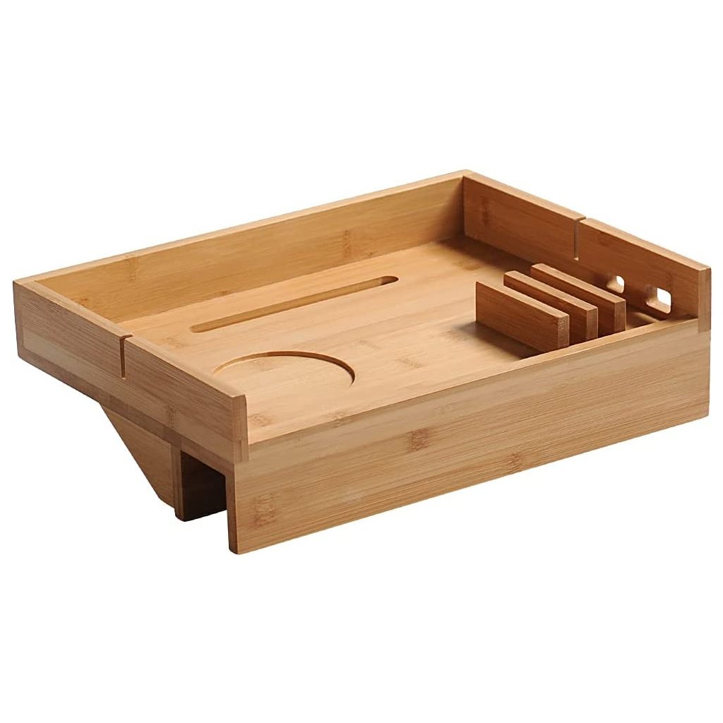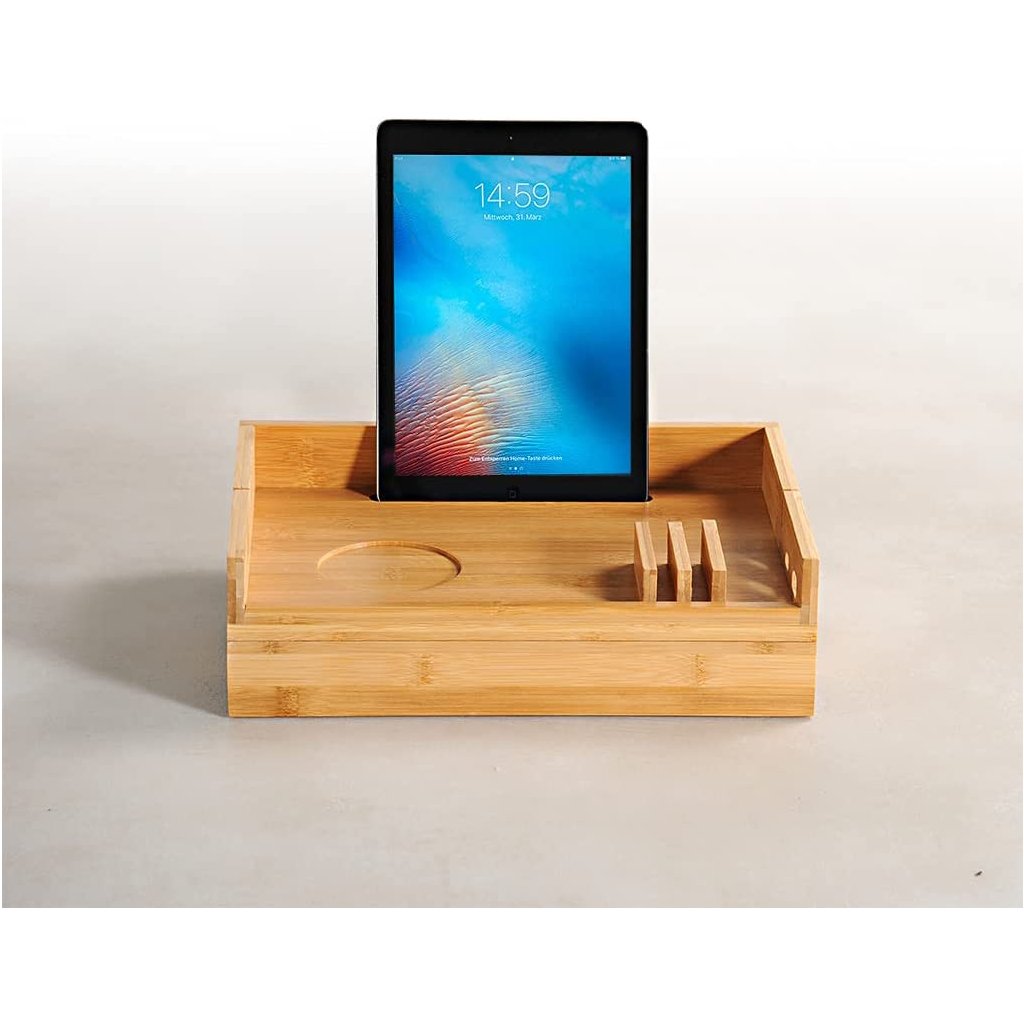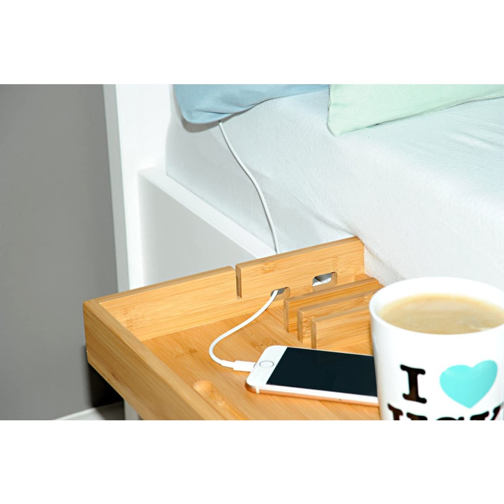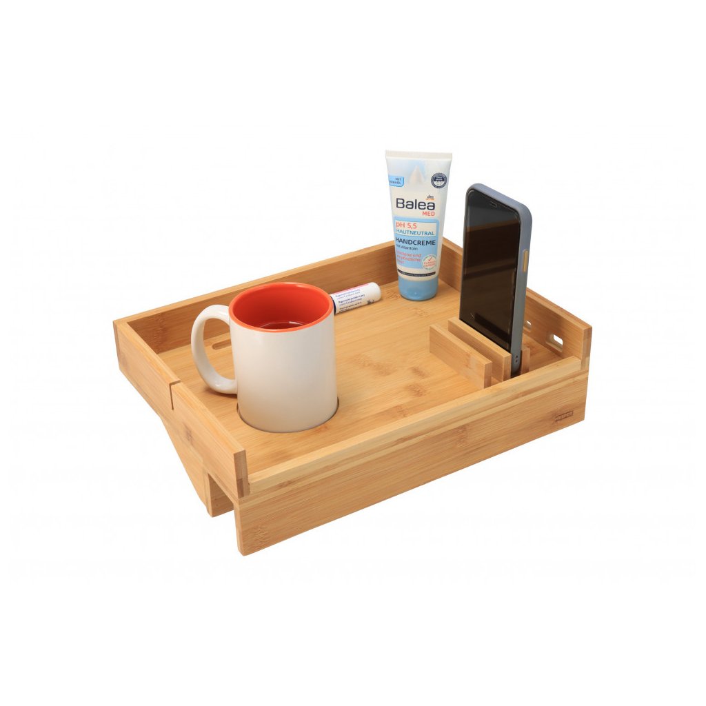Tento praktický a elegantný bambusový organizér je skvelou alternatívou k nočnému stolíku – ponúka priestor pre telefón, tablet, pitie aj drobnosti, ktoré nechcete loviť v perinách.