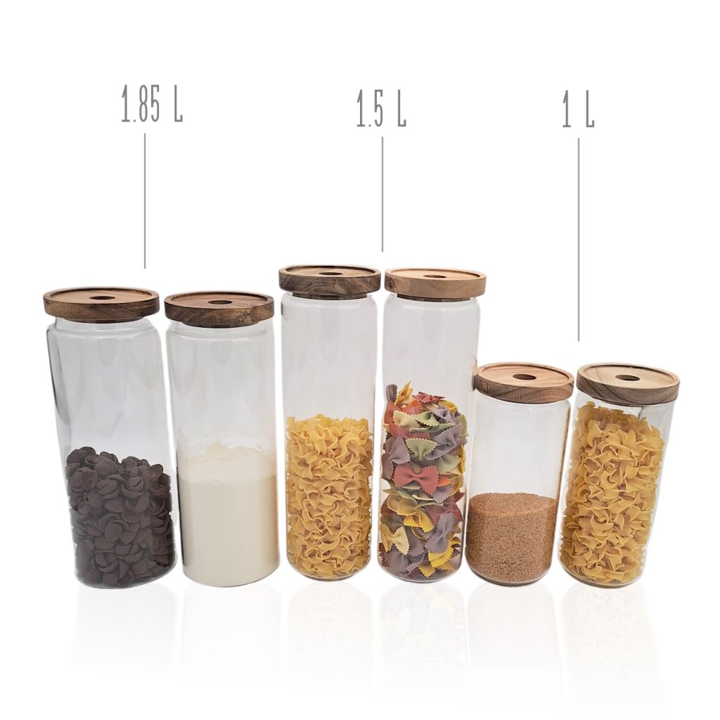 Minimalistický a moderný štýl sa tu spája s funkčnosťou a kvalitnými materiálmi. Tieto sklenené dózy s viečkami z pravého akátového dreva nielen ozdobia vašu kuchyňu, ale zaistia aj praktické, hygienické a dlhodobé uloženie suchých potravín.