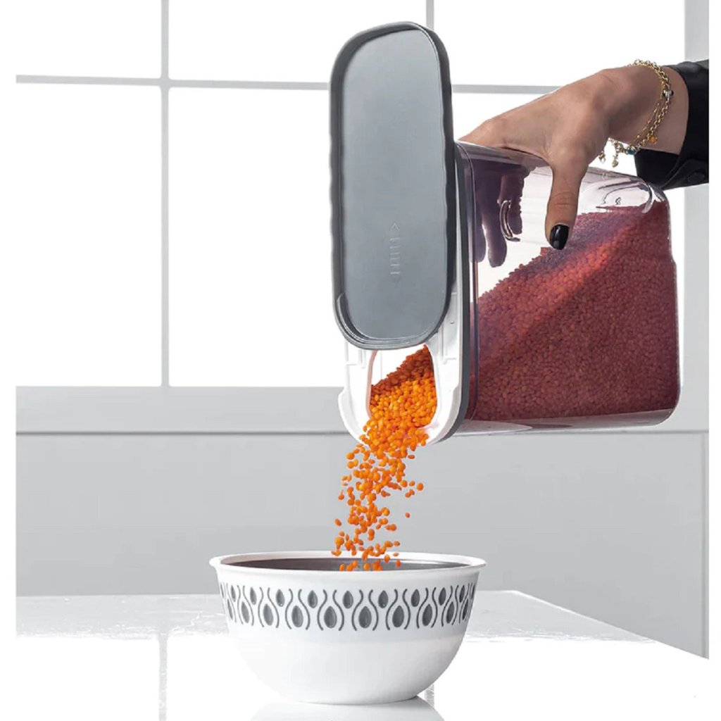 Už žiadne rozsypané balíčky múky alebo vrecúška s cukrom! Táto praktická dóza s dávkovacím posúvacím uzáverom je ideálnym riešením na prehľadné a hygienické skladovanie suchých potravín. Či už varíš alebo pečieš, odmerka na viečku ti pomôže s presným dávkovaním – bez zbytočného neporiadku.