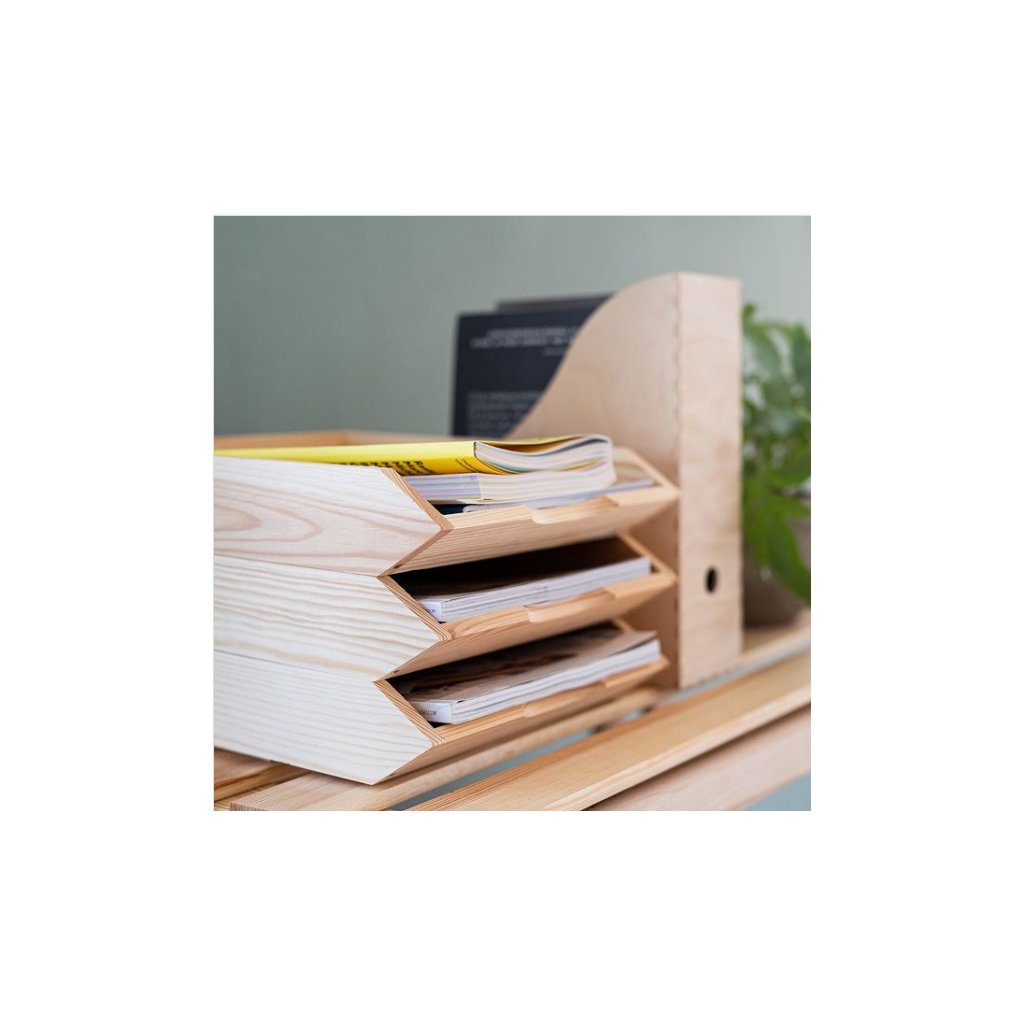 Udržujte poriadok vo svojej kancelárii a dodajte jej prírodný nádych s týmto dreveným organizérom! Vyrobený z borovicového dreva, nielenže prevonia vašu kanceláriu, ale taktiež ide o ekologickú voľbu. Je navrhnutý presne pre dokumenty vo formáte A4 a jeho stohovateľná konštrukcia umožňuje úsporné skladovanie väčšieho množstva papierov bez toho, aby zaberal príliš veľa miesta. Hlavnou výhodou je uloženie dokumentu na šírku, t.j. že môže lepšie zapadnúť do police s rozmermi do 27cm.