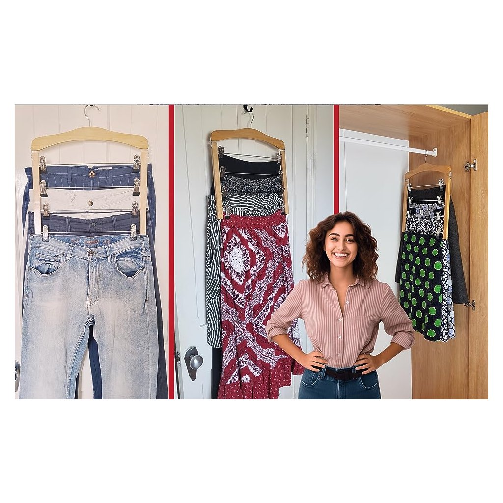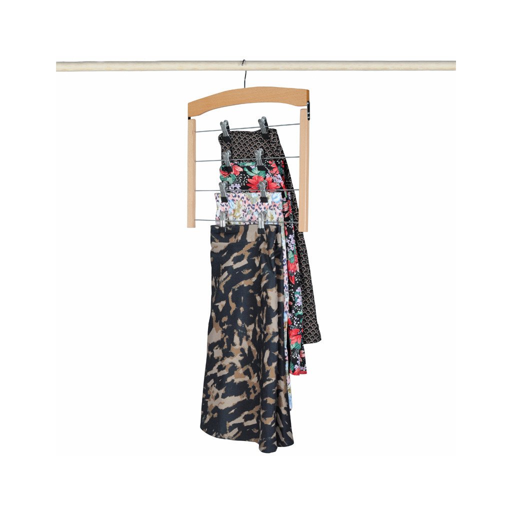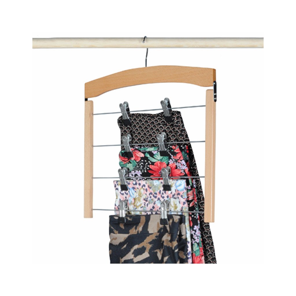 Máte obmedzený priestor v skrini, ale veľa sukní a nohavíc? Tento praktický drevený vešiak so 4 tyčami a pevnými sponami vám pomôže efektívne usporiadať oblečenie, zabráni jeho pokrčeniu a zároveň ušetrí miesto. Pogumované spony zaistia, že oblečenie bude držať pevne a nezanechá odtlačky ani nepoškodí tkaninu.