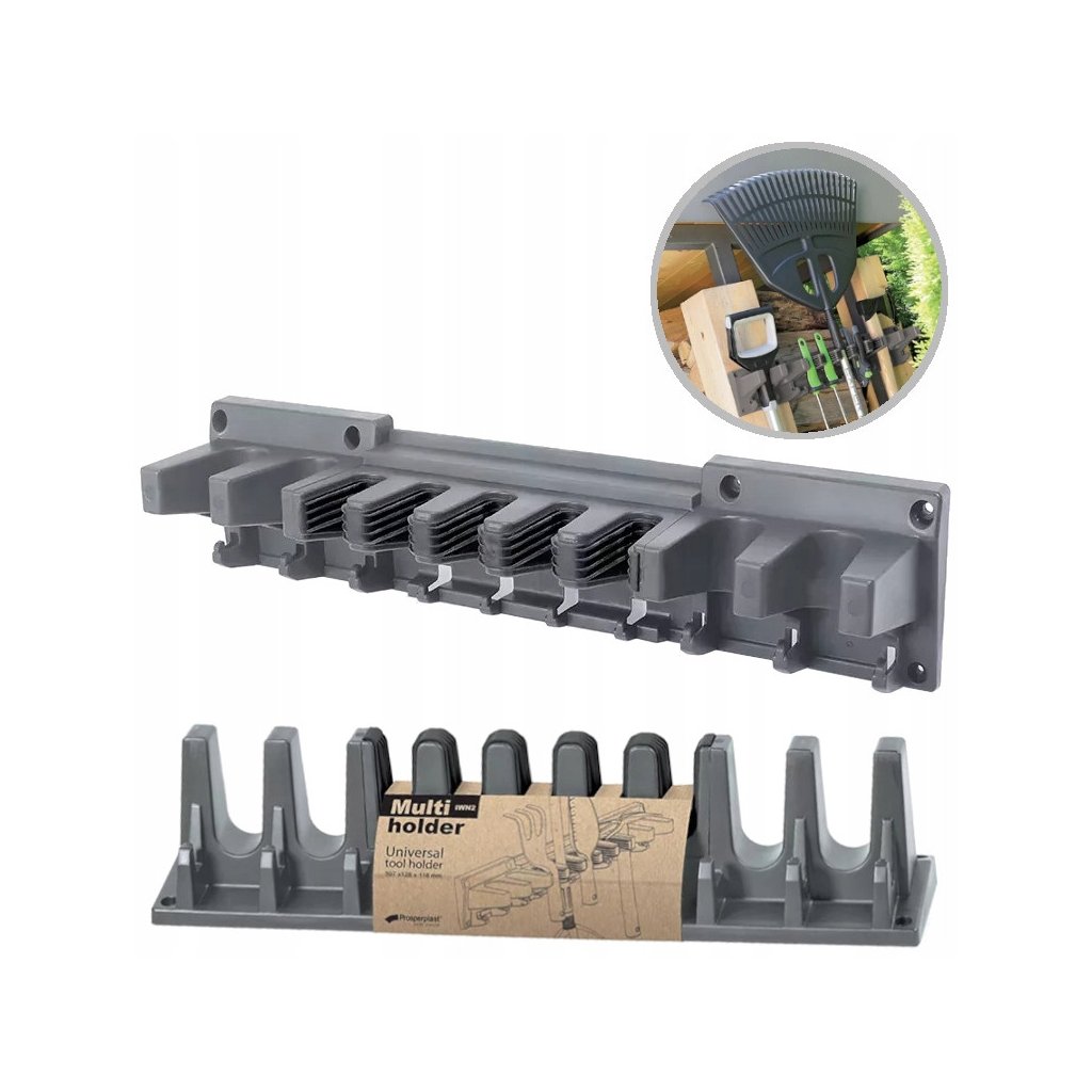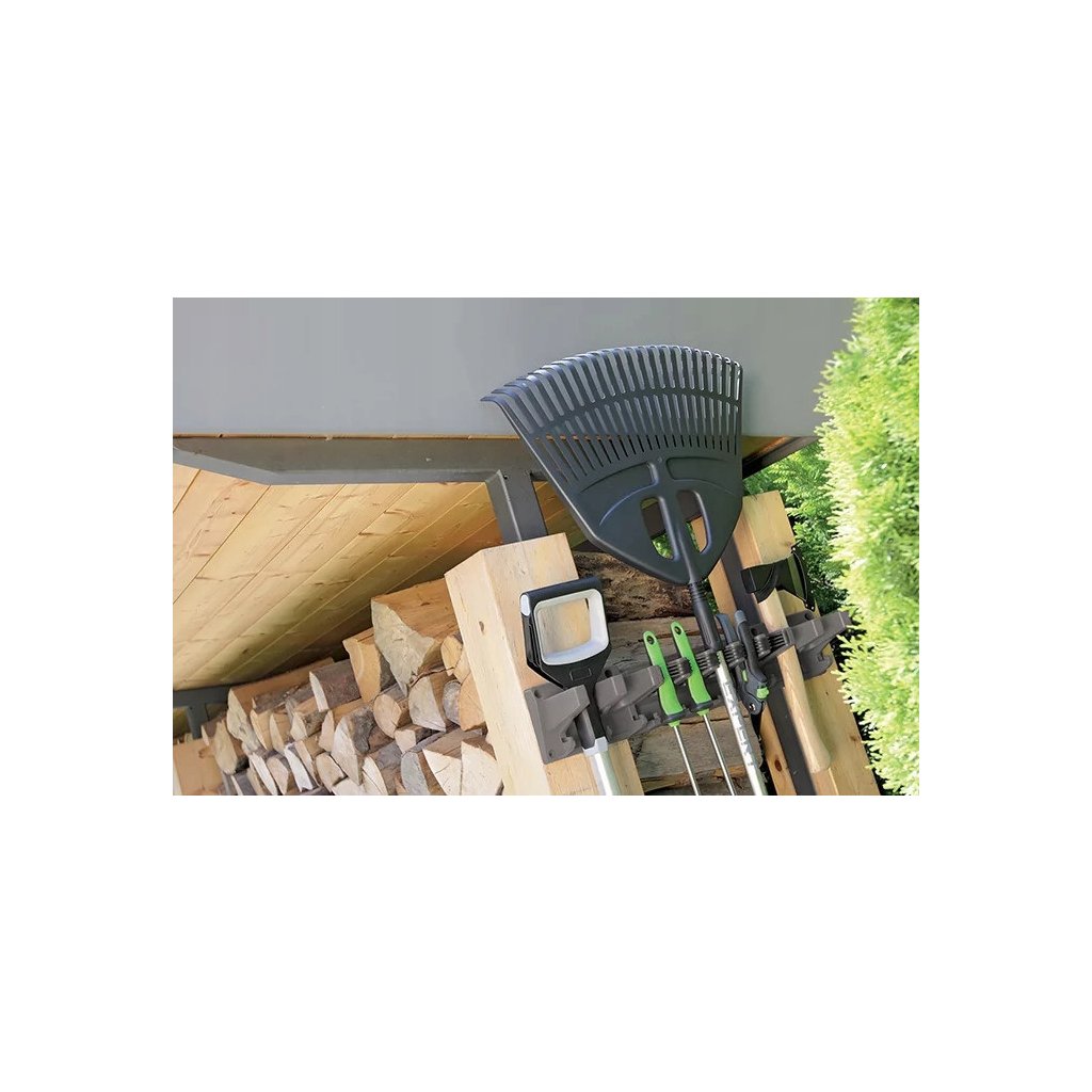 - Univerzálne uchytenie: 9 upínacích priehlbín s gumovými vložkami na zavesenie nástrojov s rukoväťou, ako sú rýle, hrable, lopaty a pod.