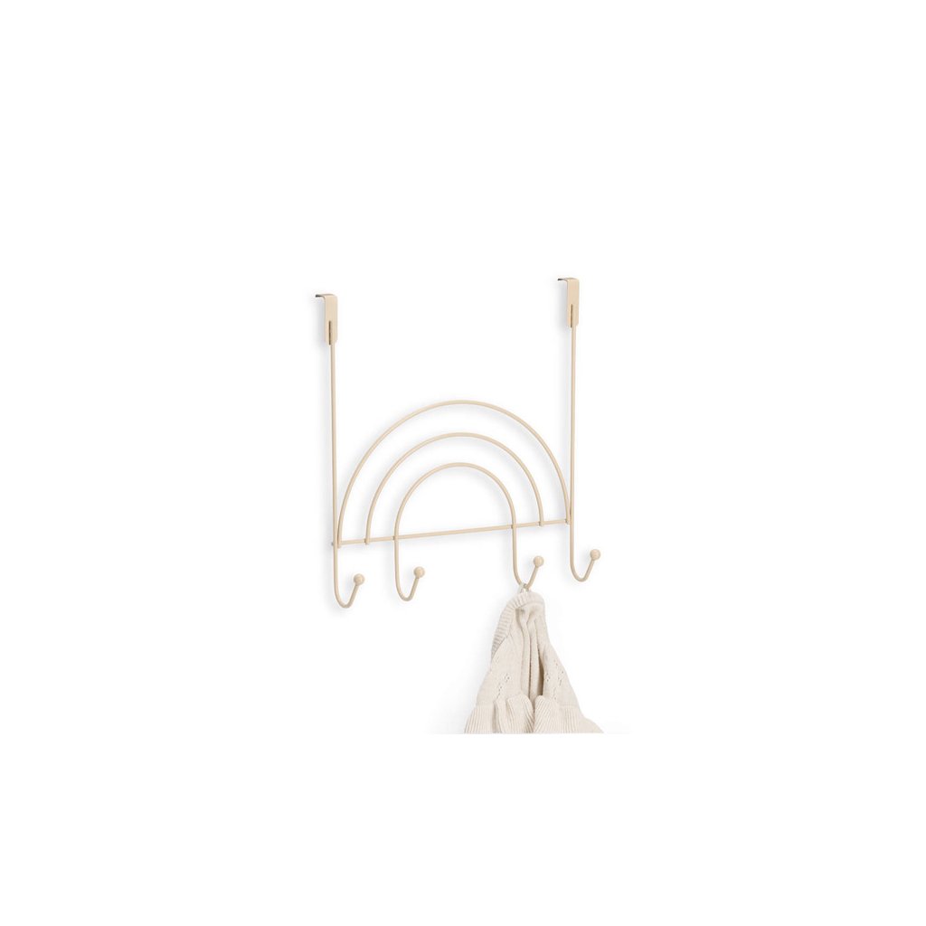 Dverový vešiak "Rainbow" je skvelým pomocníkom do detskej izby alebo predsiene, ktorý zaistí poriadok a zároveň ozdobí dvere svojím krásnym dizajnom v tvare dúhy. Tento vešiak ponúka 4 háčiky, na ktoré si deti môžu ľahko zavesiť svoje bundy, tašky alebo klobúky a mať ich tak vždy poruke.