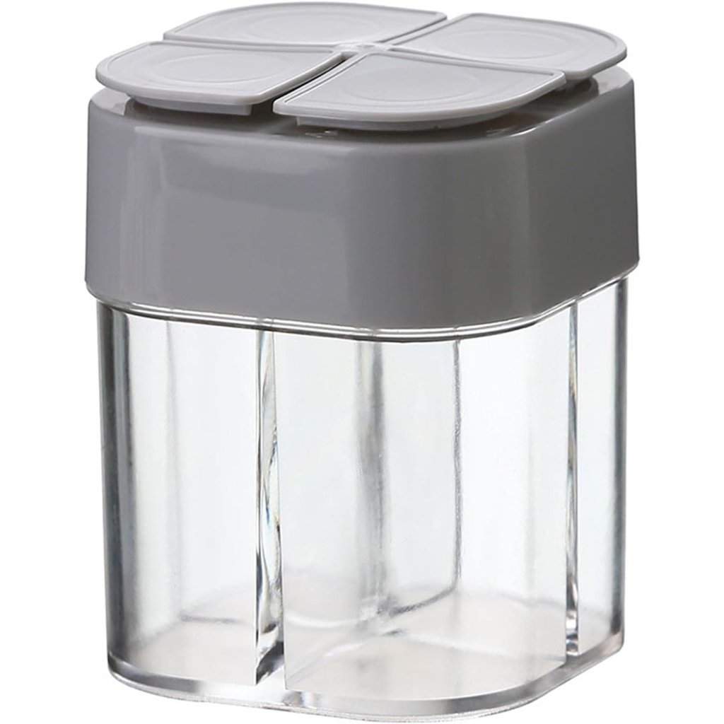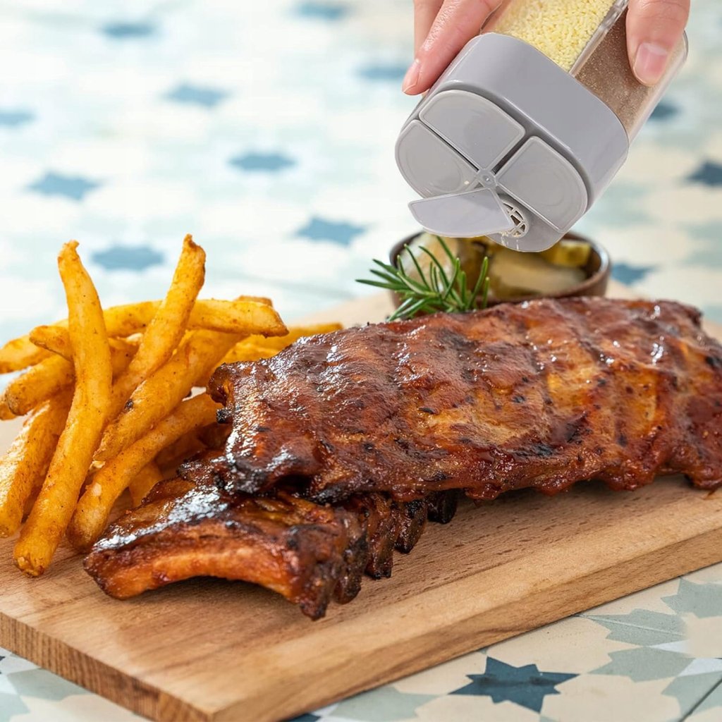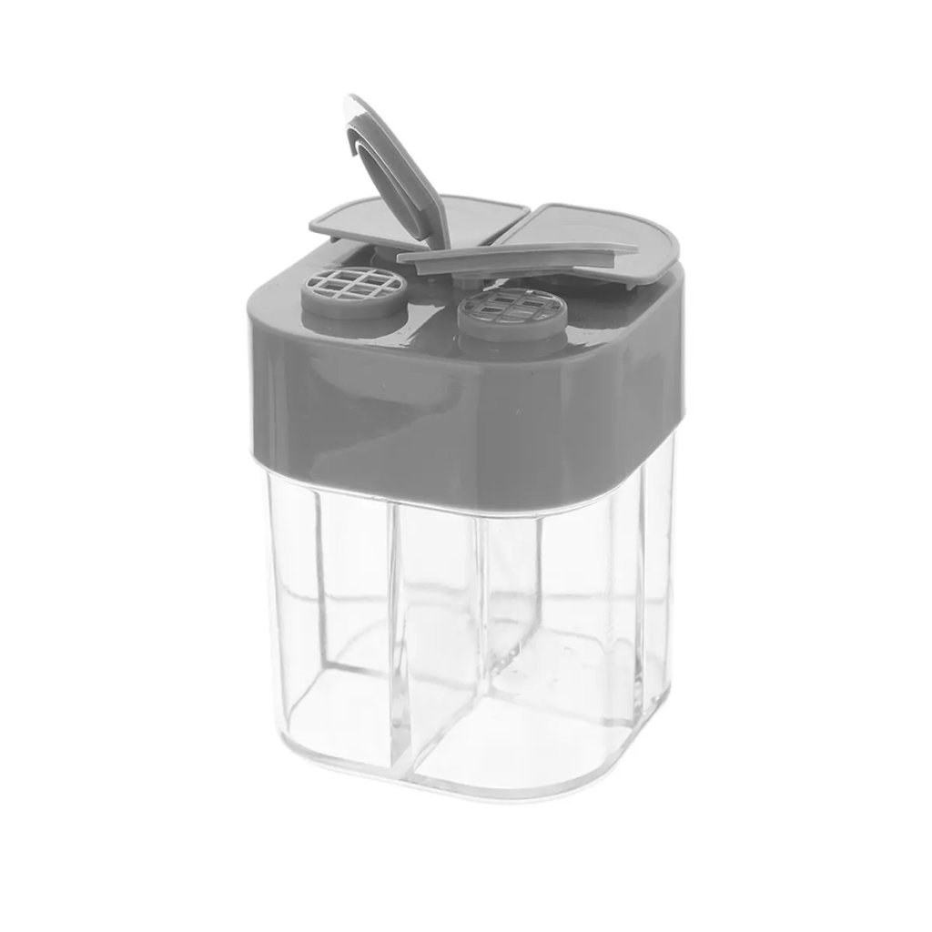 - Delený dizajn: Korenička je rozdelená na 4 sekcie, čo umožňuje uložiť až 4 rôzne koreniny súčasne. Každá sekcia má svoje vlastné odklápacie viečko a sypátko