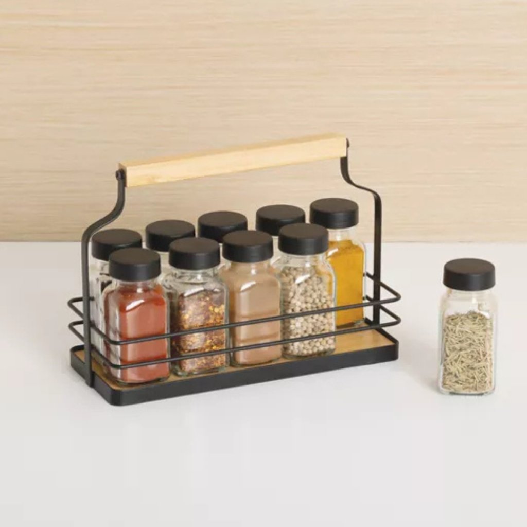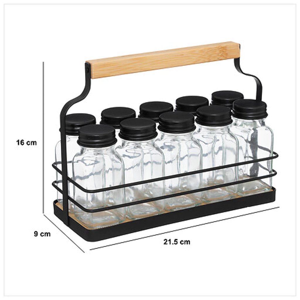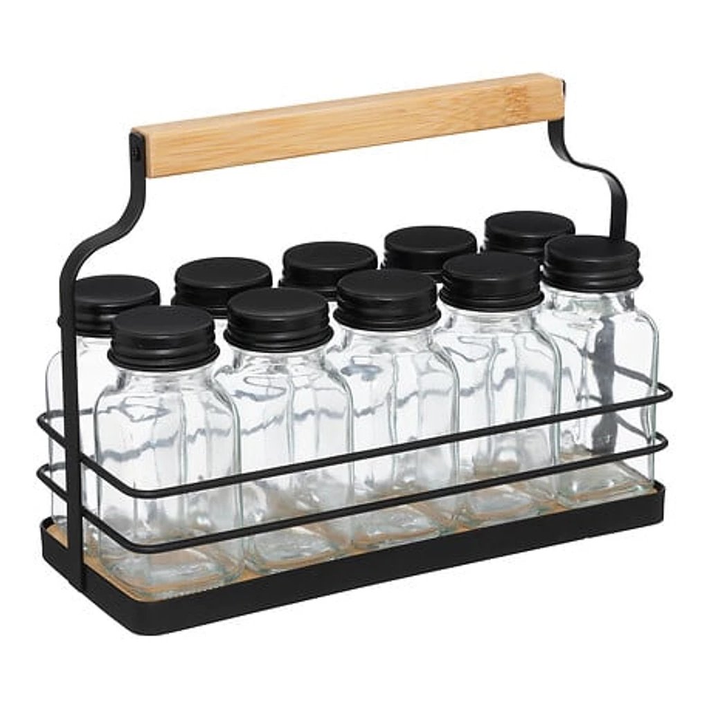 🧂 Košík s 10 hranatými koreničkami, čierne viečka, kov, drevo 22 x 9 x 16 cm
