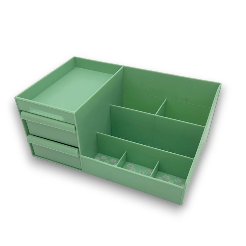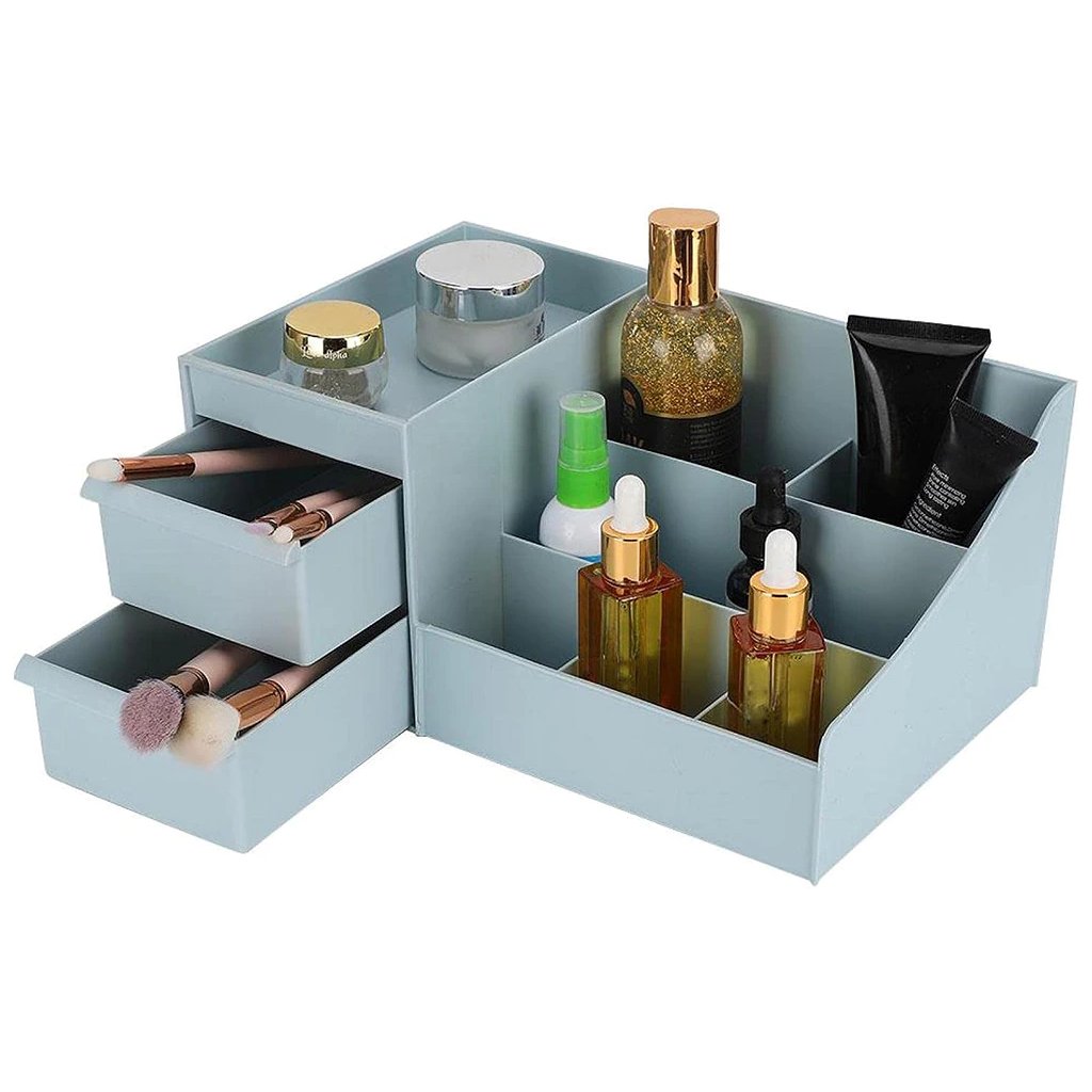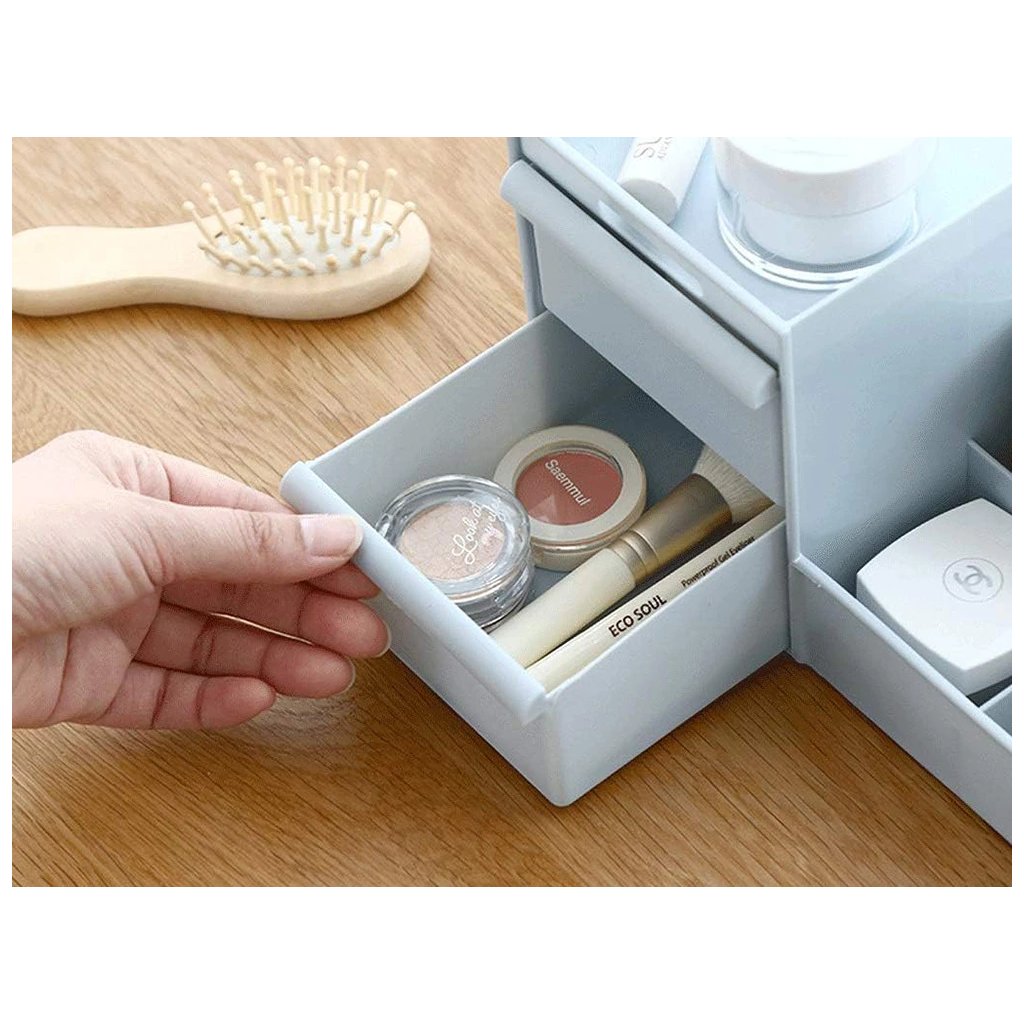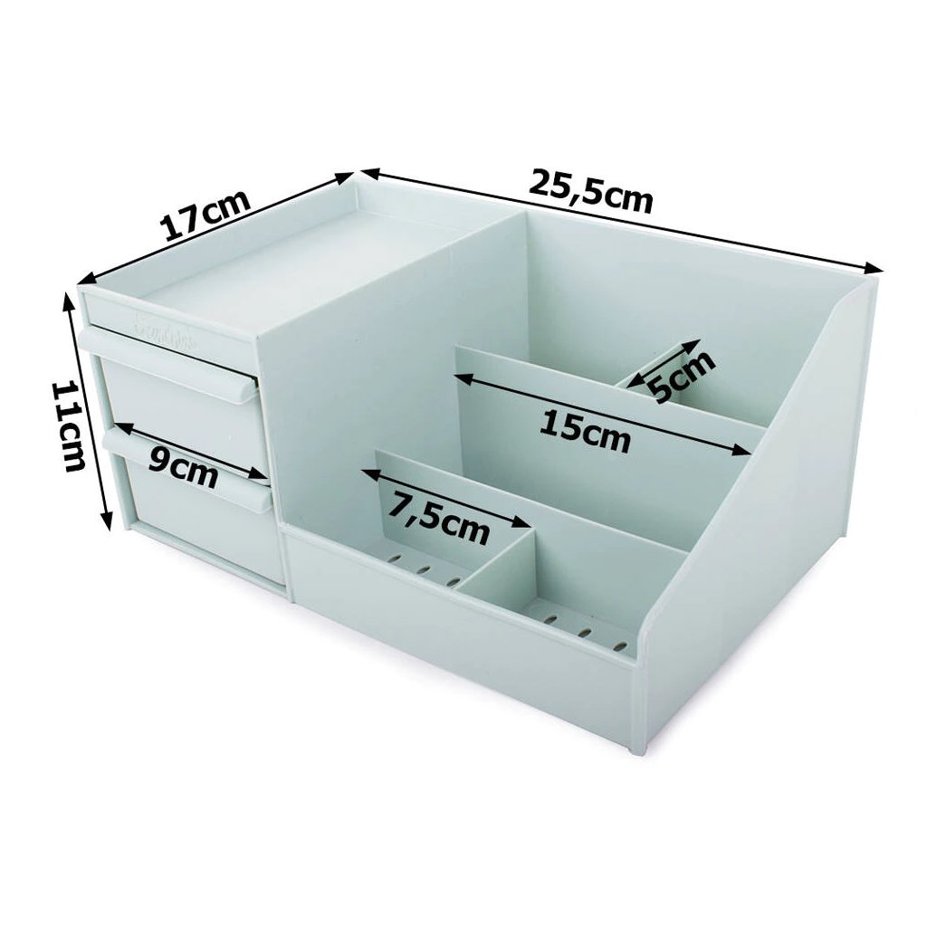 Tento praktický kozmetický organizér s dvoma zásuvkami a stupňovitým usporiadaním vám pomôže zorganizovať každodennú rutinu a zároveň ušetrí miesto na toaletnom stolíku, v kúpeľni aj v kancelárii.