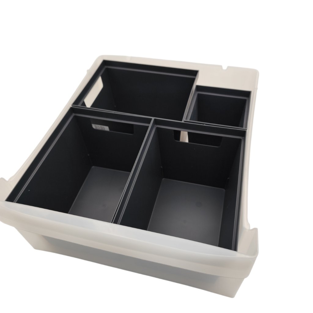 ✔ Modulárne a stohovateľné riešenie – boxy na seba bezpečne zapadnú vďaka zarážkam na hornej strane