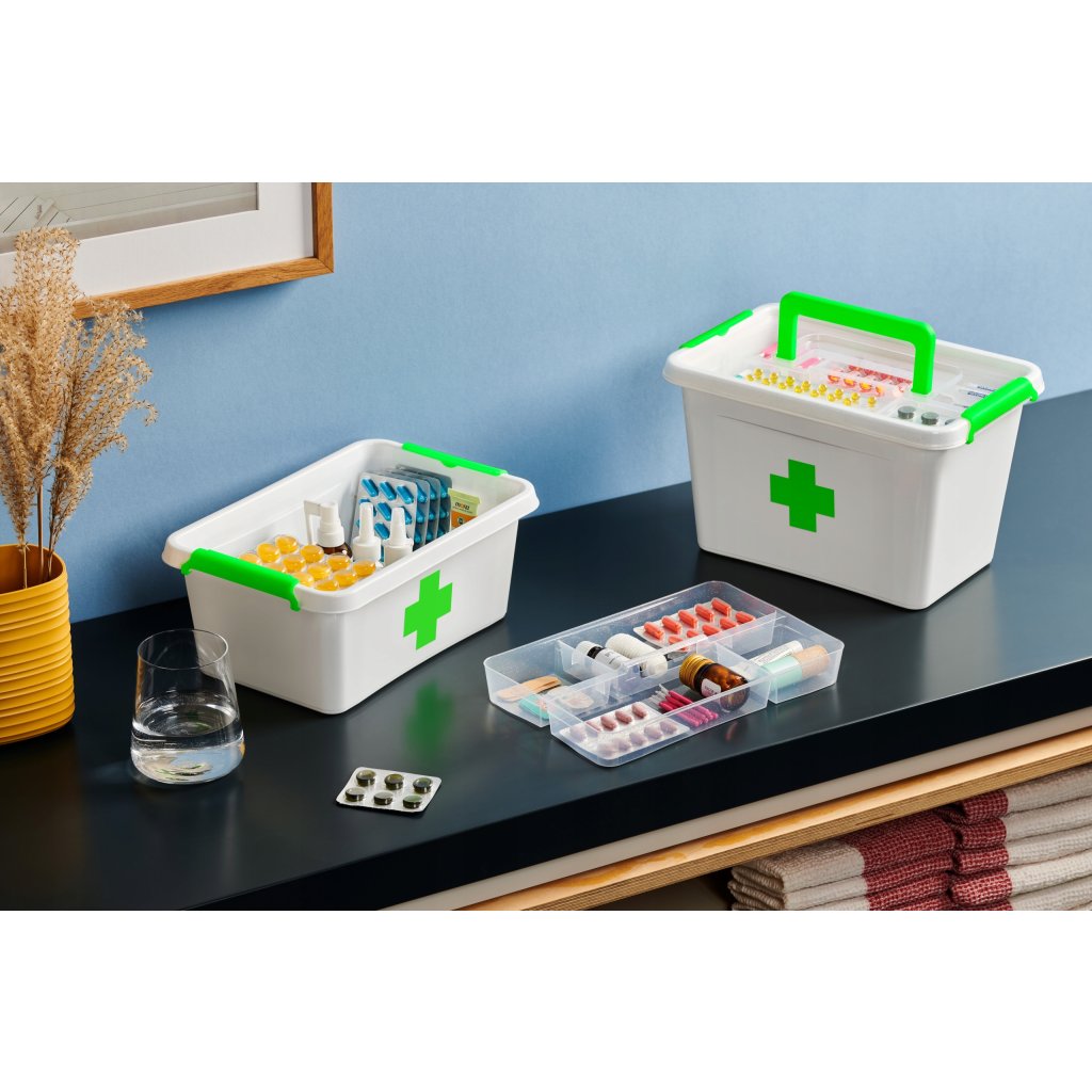 Hľadáte bezpečné a hygienické miesto na uloženie liekov, zdravotníckeho materiálu alebo prvej pomoci? Tieto úložné boxy s antibakteriálnou ochranou sú ideálnou voľbou! Špeciálny plast s mikročasticami striebra zabraňuje šíreniu baktérií, a navyše sú boxy vybavené praktickým organizérom pre jednoduché triedenie.