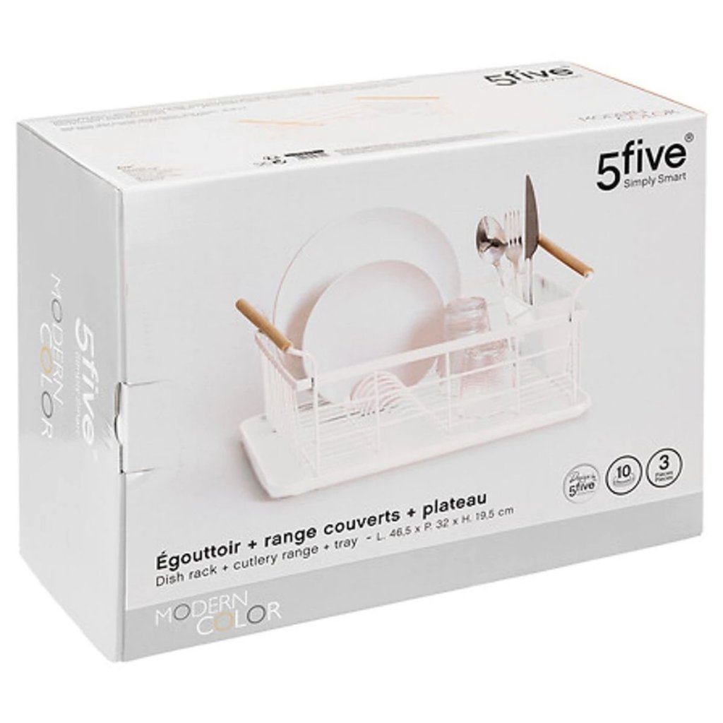 Moderné a praktické riešenie, ako udržať kuchynskú linku suchú a riad prehľadne usporiadaný. Tento veľký biely odkvapkávač s drevenými rúčkami má miesto na taniere, poháre, príbory aj hrnce. Drevo dodáva hrejivý akcent, zatiaľ čo pevná konštrukcia zaistí dlhú životnosť. Vďaka šikovnému dizajnu s táckou a miskou na príbory bude vaša kuchyňa čistá, suchá a elegantná.