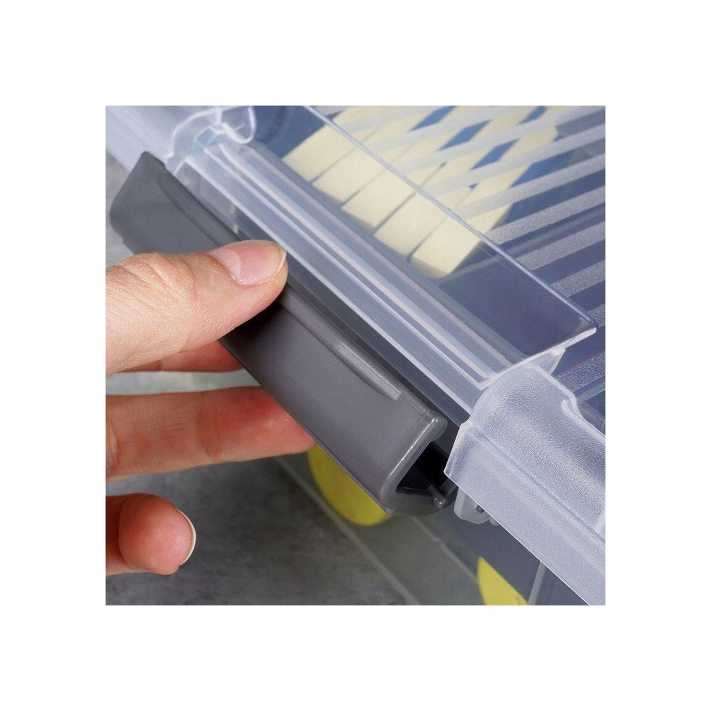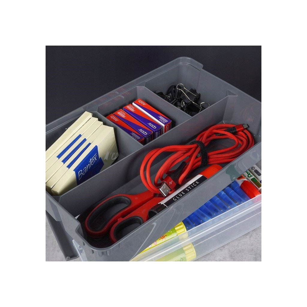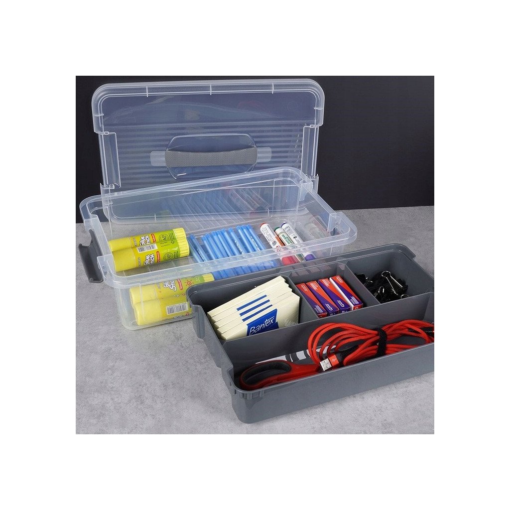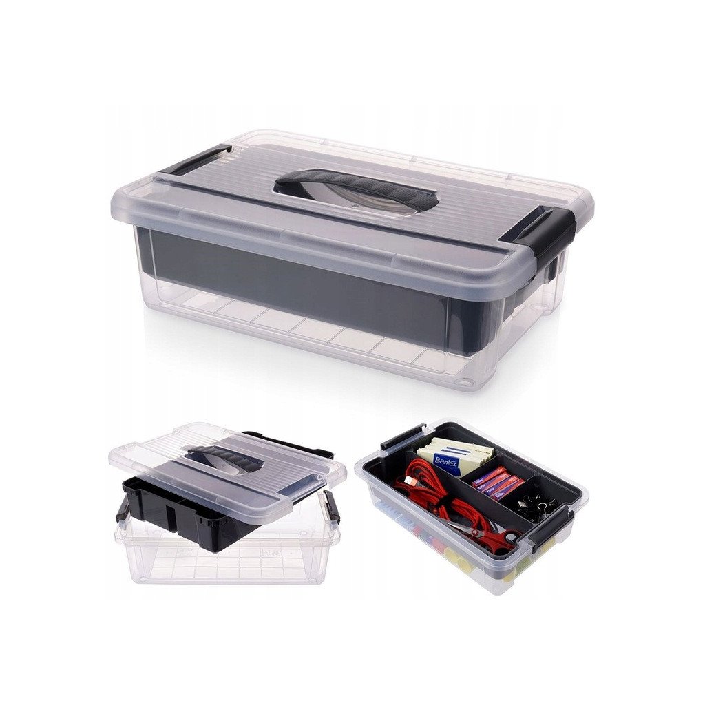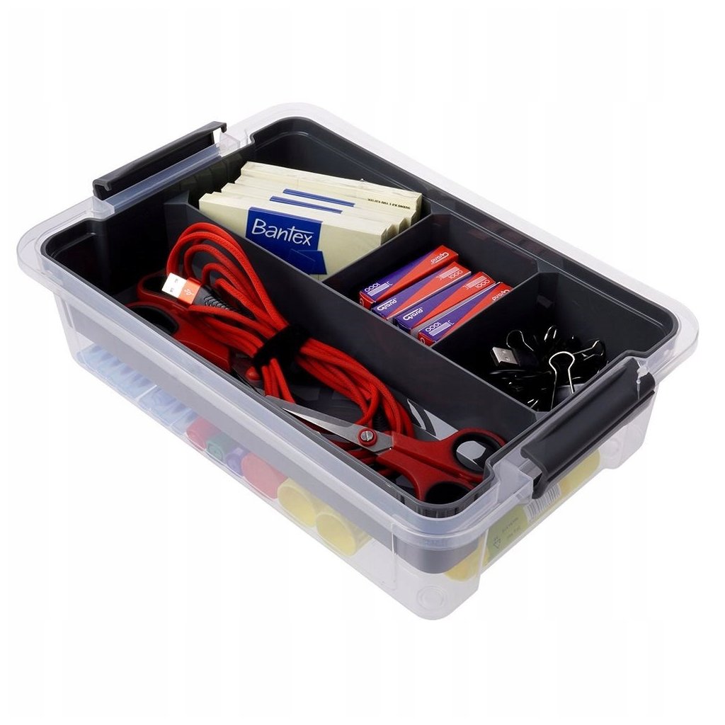 Praktický úložný box s transparentným telom a vnútornou vložkou s priehradkami je skvelým pomocníkom na uloženie všetkých drobností aj väčších potrieb. Či už ho využijete ako lekárničku, box na šitie, technickú krabičku alebo úložný priestor na kozmetiku – vždy budete mať prehľad a všetko po ruke.