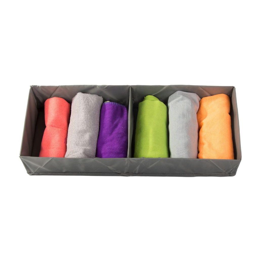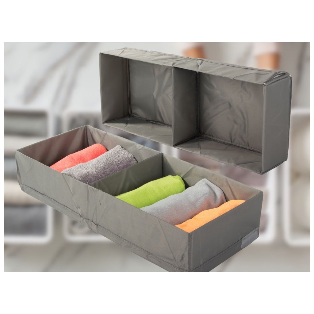 Chcete mať šatník krásne usporiadaný a všetko hneď po ruke? Tento praktický textilný organizér s deliacou prepážkou vám pomôže udržať prehľad v zloženom oblečení, bielizni aj doplnkoch. Vďaka hĺbke 51 cm je ideálny na skladanie oblečenia metódou Marie Kondo – teda za seba, nie na seba. Dve veľké priehradky vám umožnia oblečenie pohodlne roztriediť. Je ľahký, skladný, ale zároveň pevný – vystužený bokmi z kartónu a vyrobený z odolného materiálu, ktorý sa ľahko čistí.