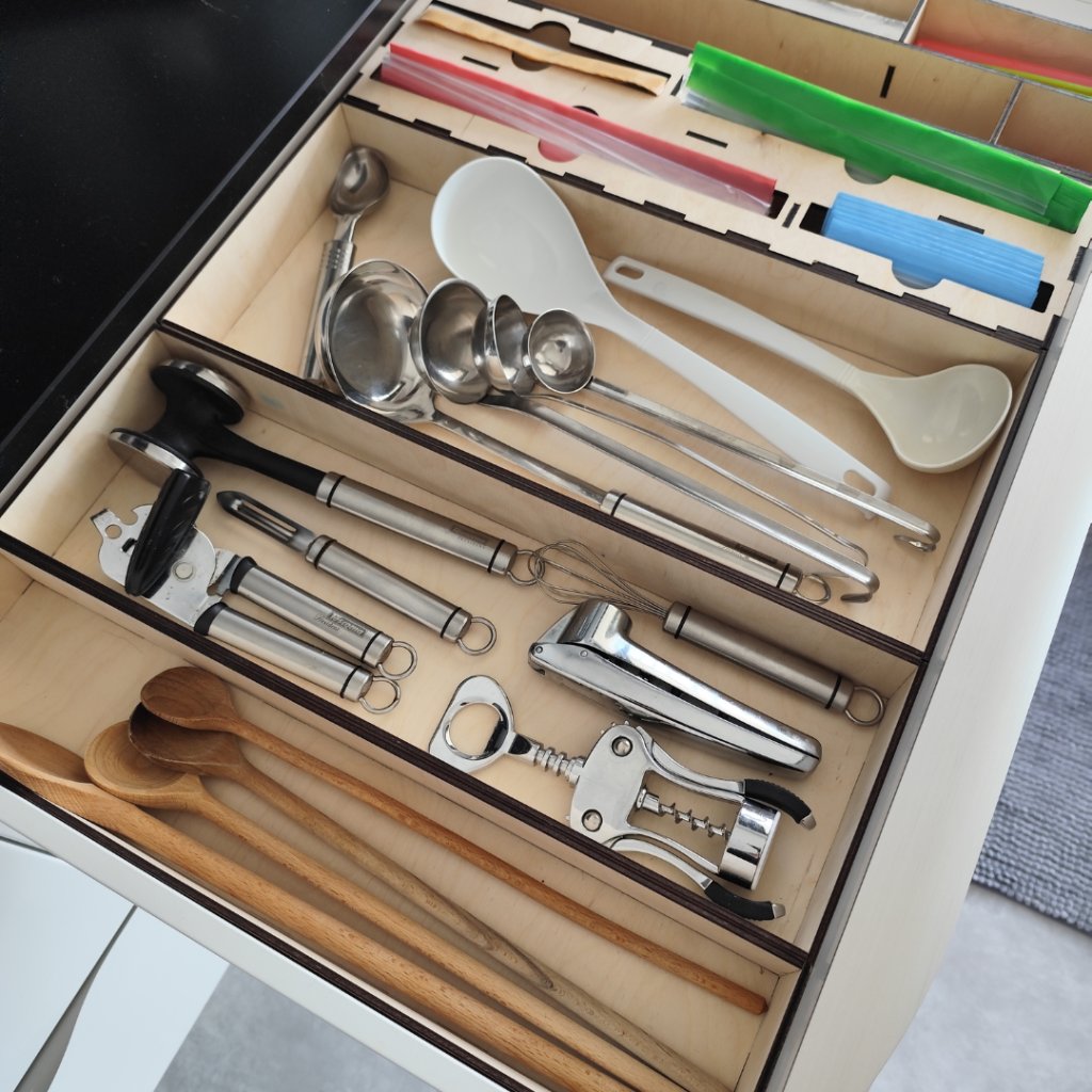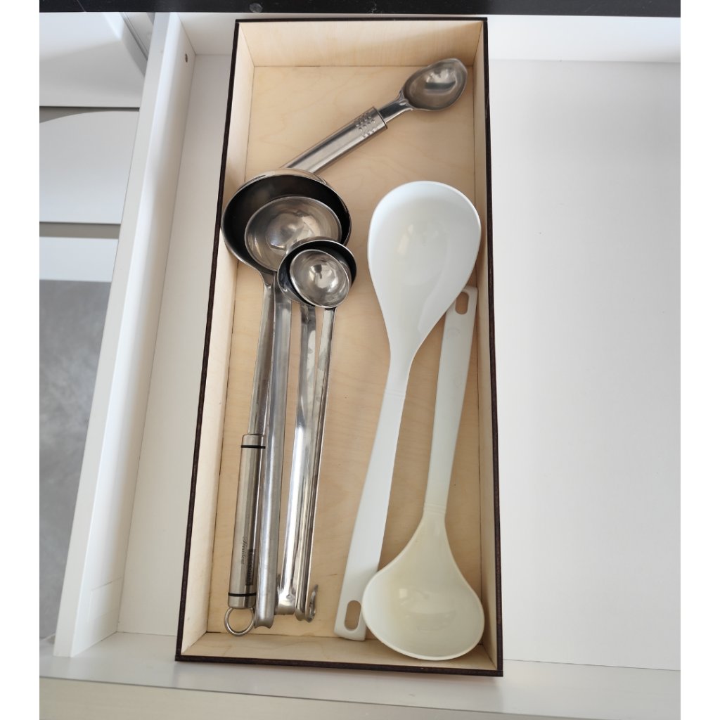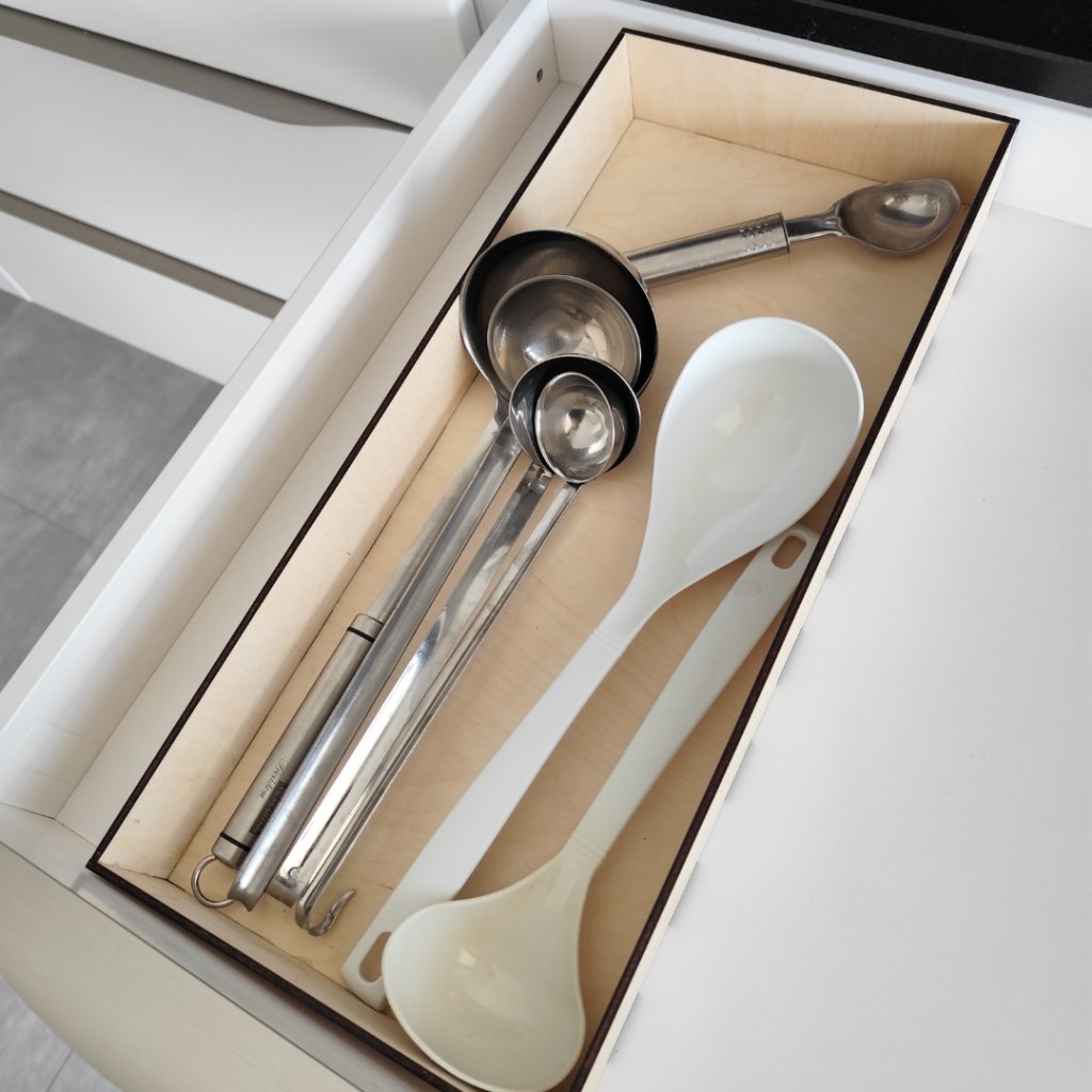 Tento drevený organizér zo série VASKY je presne navrhnutý tak, aby dokonale sedel do bežných kuchynských zásuviek a ponúkol efektívne a prehľadné uloženie aj tých najdlhších kuchynských pomocníkov.