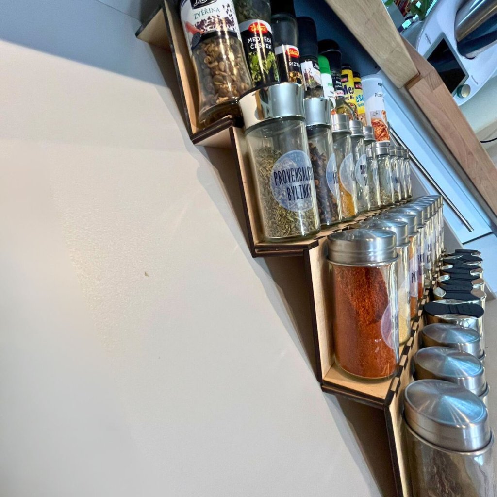 Tento drevený organizér s praktickým kaskádovitým usporiadaním vám umožní mať všetky koreniny prehľadne po ruke – bez zbytočného hľadania a neporiadku.