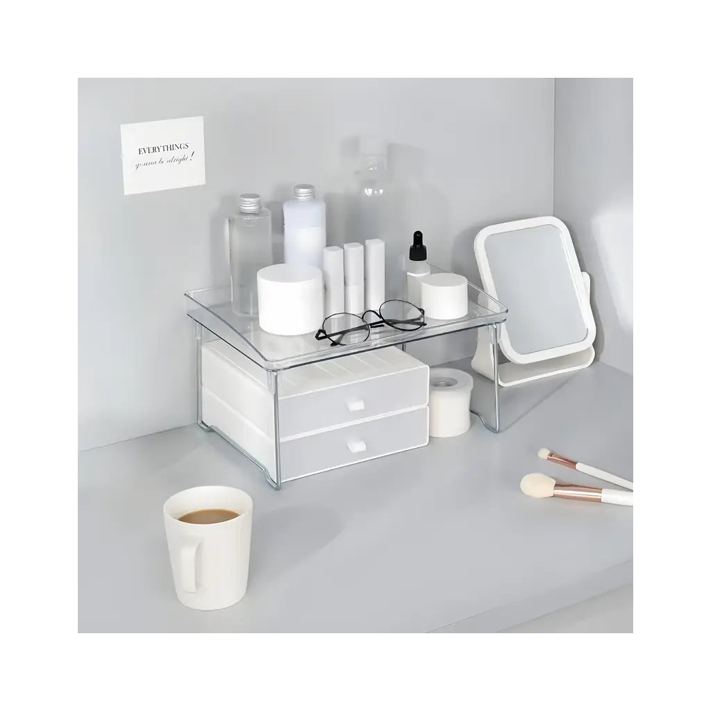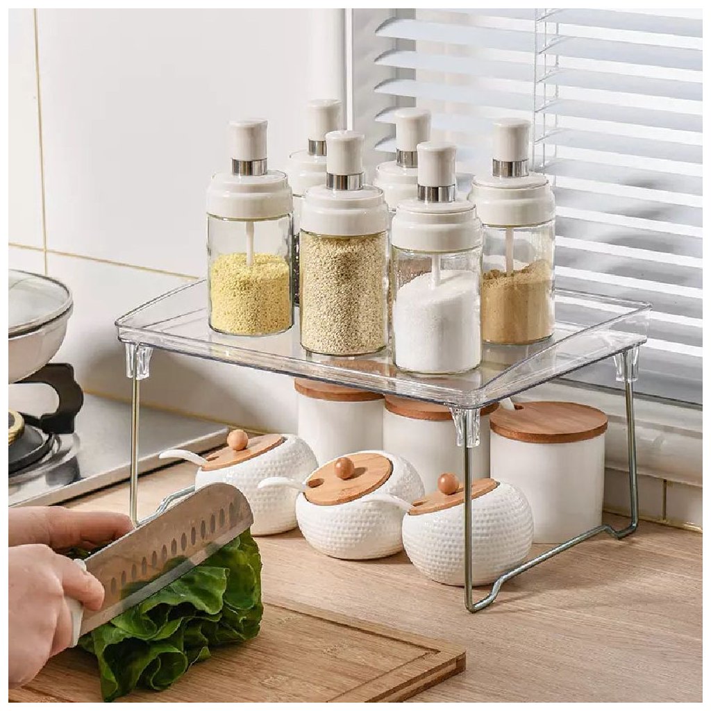 Praktická polica, ktorá okamžite vytvorí ďalší úložný priestor – či už v kúpeľni, kuchyni, kancelárii alebo na toaletnom stolíku. Vďaka priehľadnému dizajnu pôsobí nenápadne a čisto, napriek tomu elegantne a funkčne.