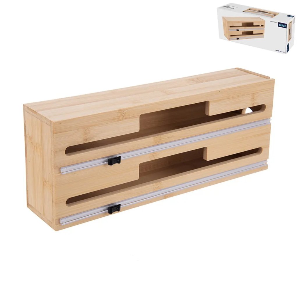Už žiadne potrhané okraje alebo neforemné ruličky v šuplíku! Táto praktická bambusová rezačka elegantne vyrieši uloženie a strihanie dvoch rolí naraz – či už ide o papier na pečenie, (malý) , ideálne alobal alebo potravinársku fóliu. Vďaka ostrým rezačom a bočnému vkladaniu rolí budete mať všetko pod kontrolou jednou rukou. Dá sa postaviť na pracovnú dosku, ale aj pripevniť na stenu – montážny materiál je súčasťou balenia.