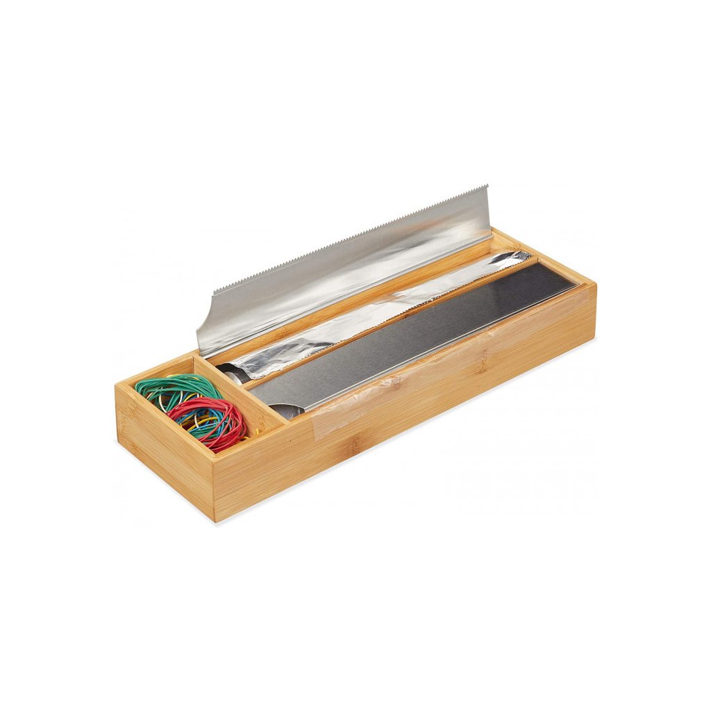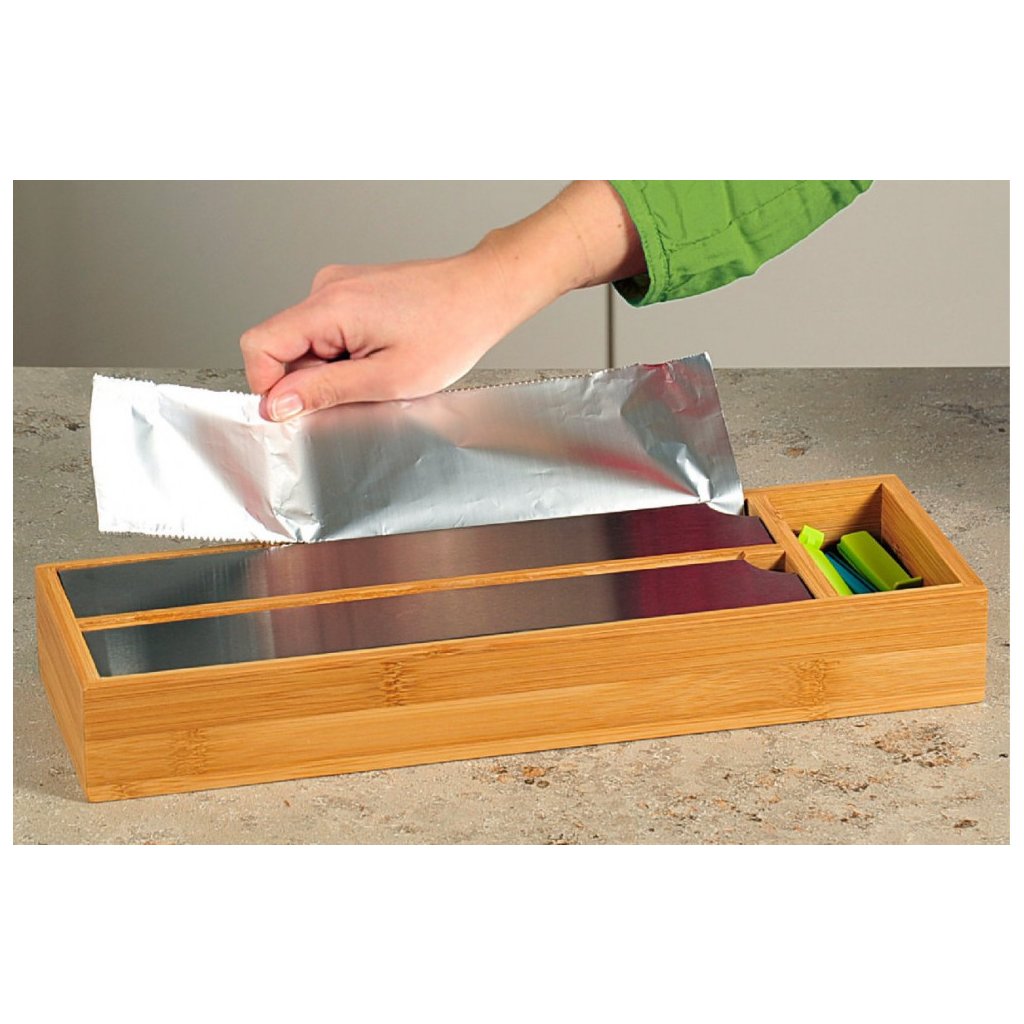 Bambusový organizér, do ktorej vložíte potravinové fólie, alobal, papier na pečenie, a pod. Má 2 veľké priehradky a jednu menšiu pozdĺžnu na drobnosti ako gumičky.