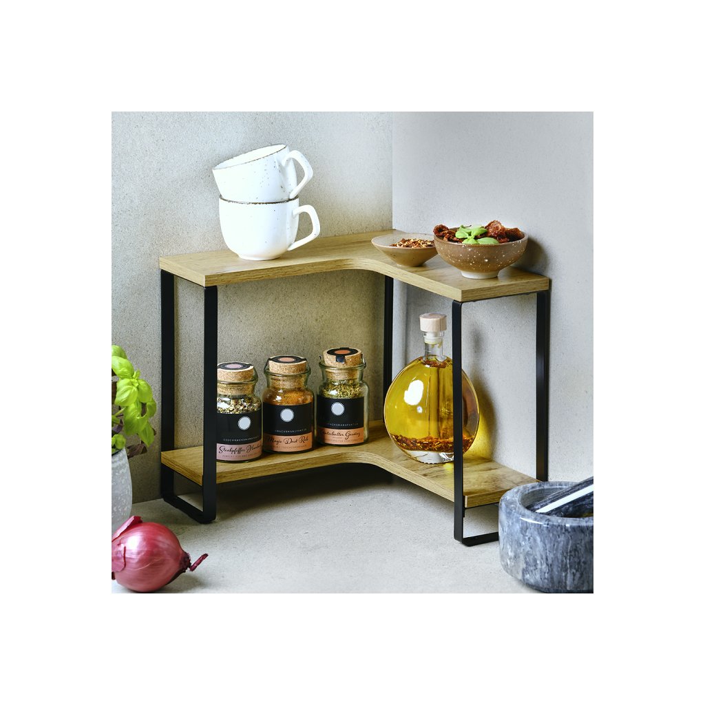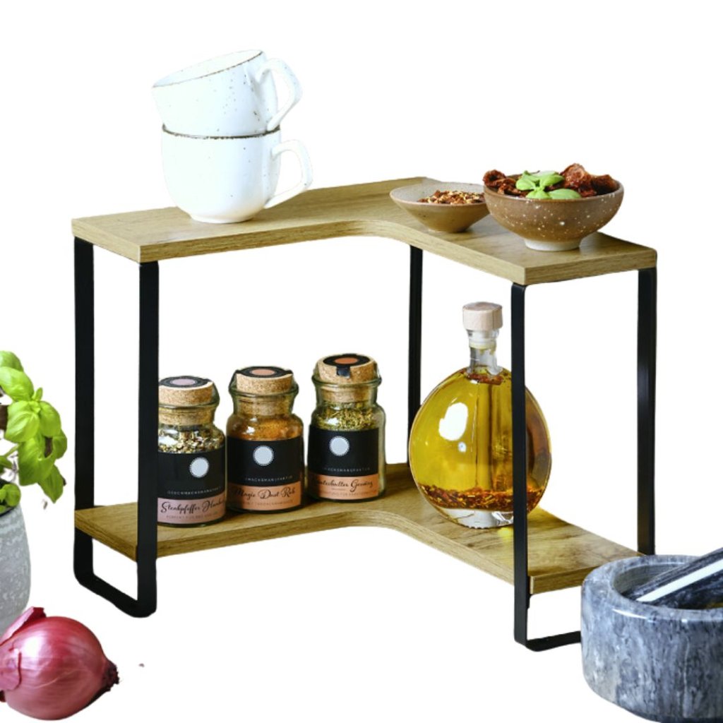 Táto štýlová dvojposchodová polica z bambusu v dekore dub s čiernymi kovovými prvkami prináša do vašej kuchyne, kúpeľne alebo obývacej izby nový úložný priestor – prirodzený, praktický a dizajnový.