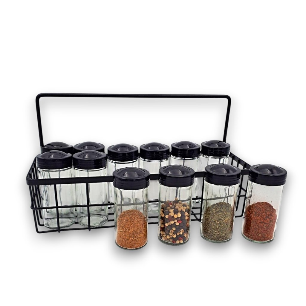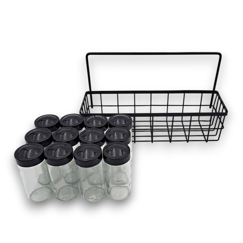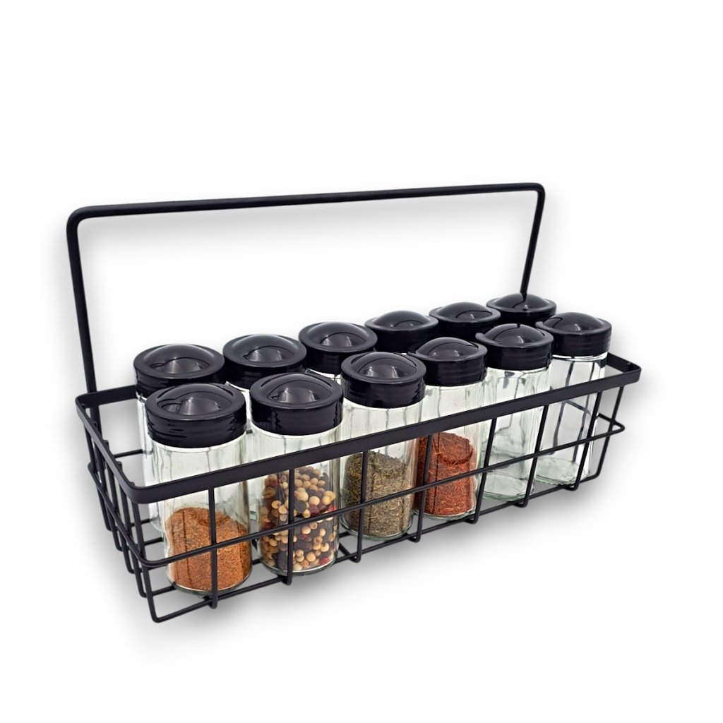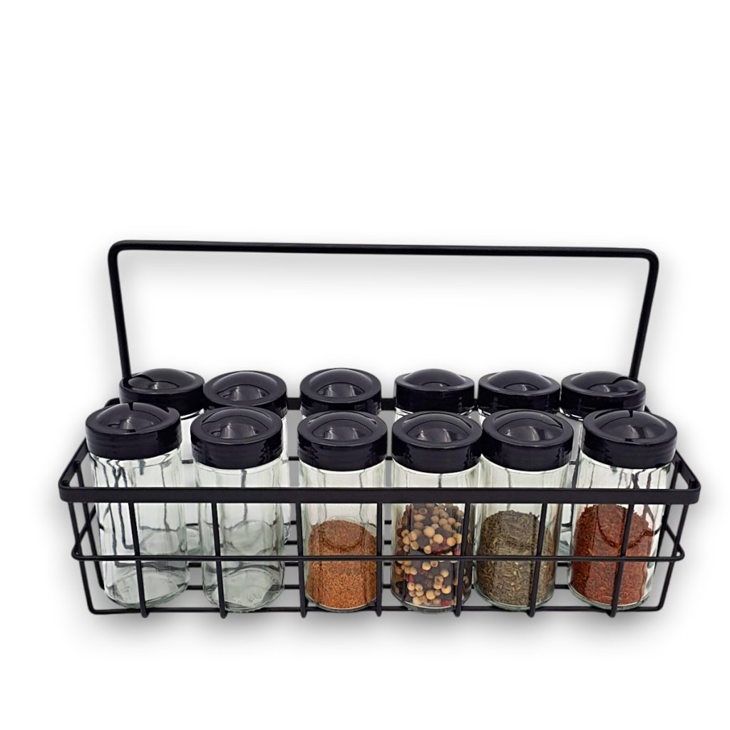 Praktická súprava koreničiek je ideálna na usporiadanie a uchovávanie všetkých druhov korenia. Obsahuje 12 elegantných sklenených koreničiek s čiernymi viečkami, ktoré sú vybavené sypátkom pre jednoduché dávkovanie. Koreničky sú umiestnené v praktickom drôtenom košíku, ktorý zaistí prehľadné a štýlové usporiadanie vašej kuchyne. Vďaka kompaktnému dizajnu súprava šetrí miesto na kuchynskej linke alebo v polici. Košík sa dá aj zavesiť.