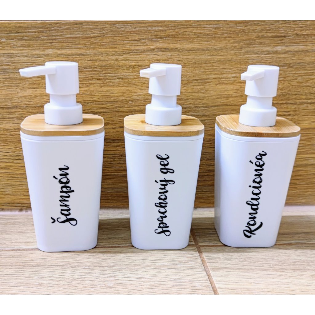 Sada 3 štítkov / nálepiek na dávkovače do kúpeľne "Sprchový gél, Kondicionér, Šampón"