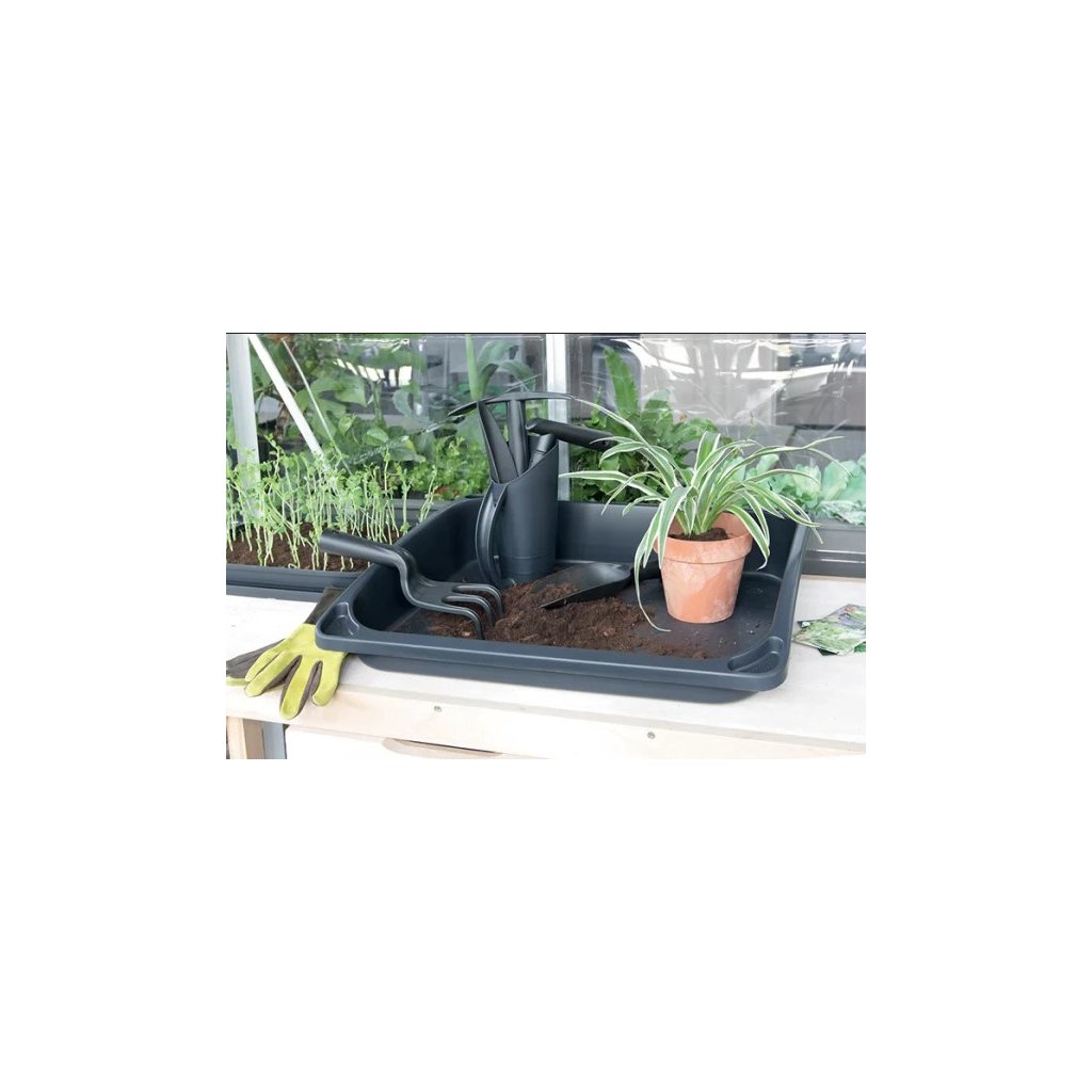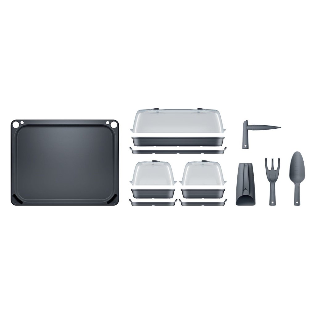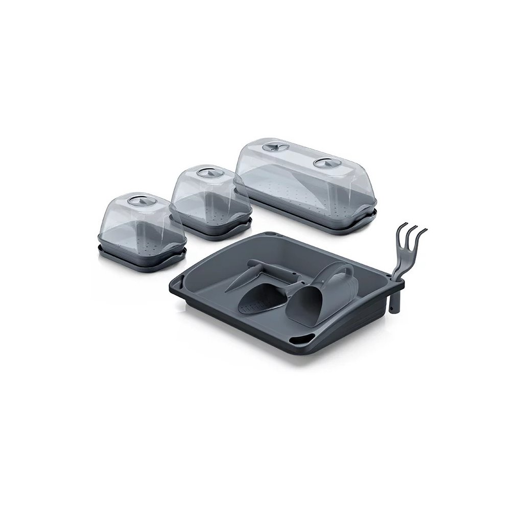 ✅ Kompletná sada – obsahuje podstavec, tri sadbovače s krytmi a sadu záhradného náradia