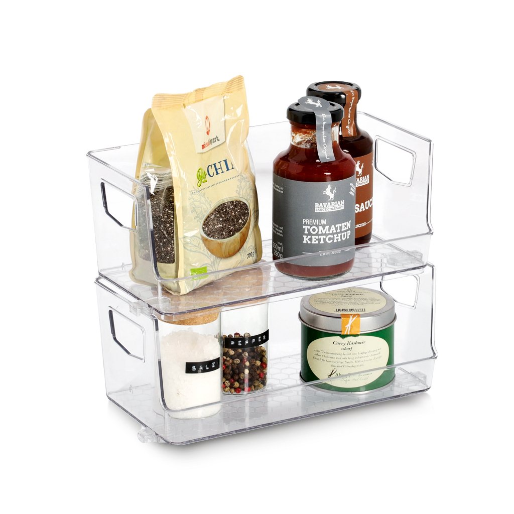Získajte dokonalú organizáciu vo vašej kuchyni! Tieto praktické stohovateľné organizéry vám pomôžu udržať si prehľad v špajze, chladničke aj kuchynských skrinkách. Transparentné prevedenie umožňuje ľahko vidieť obsah a otvorená predná strana zabezpečuje rýchly prístup k potravinám.