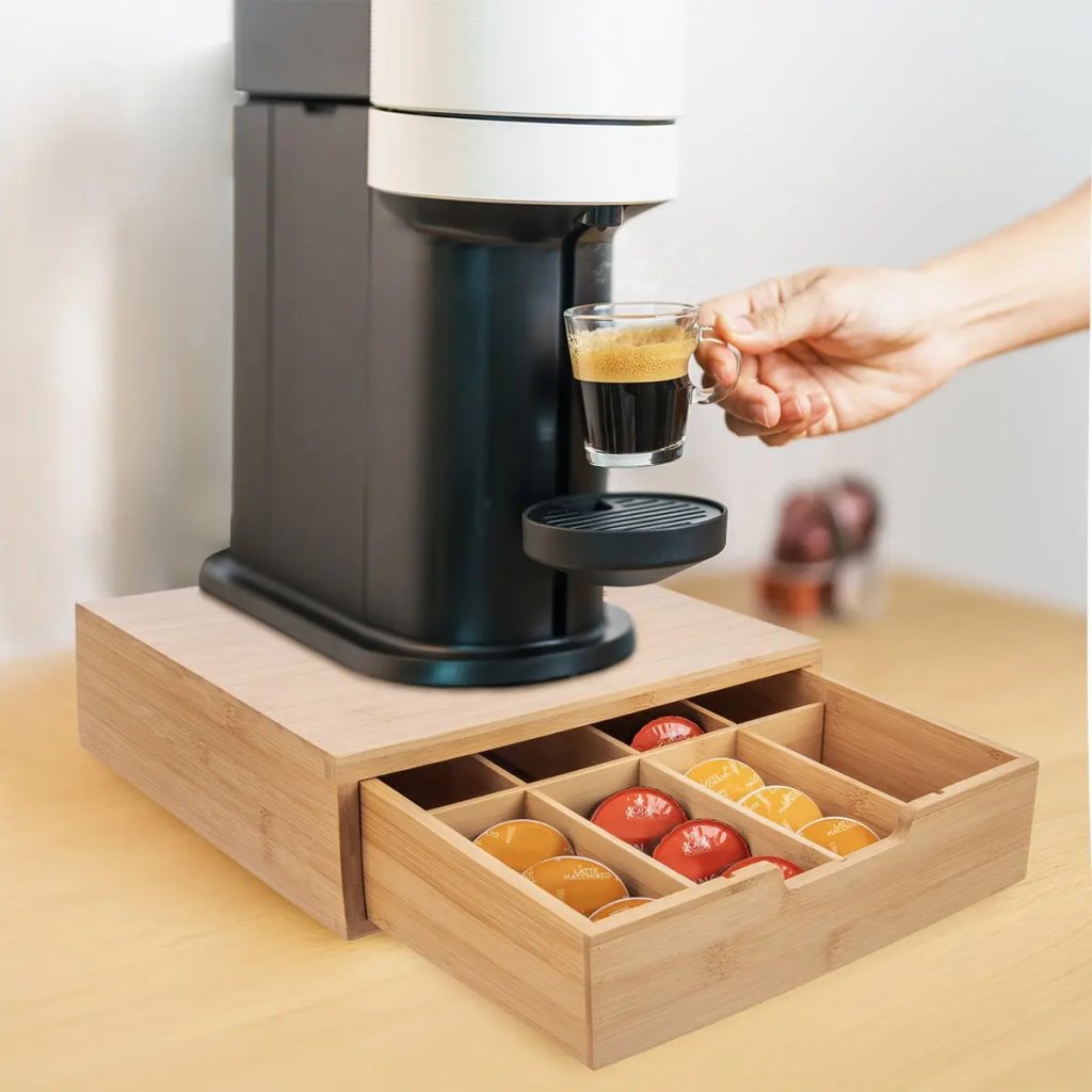 ☕ Kuchyňa – stojan pod kávovar alebo kanvicu, kapsuly a čaje v zásuvke