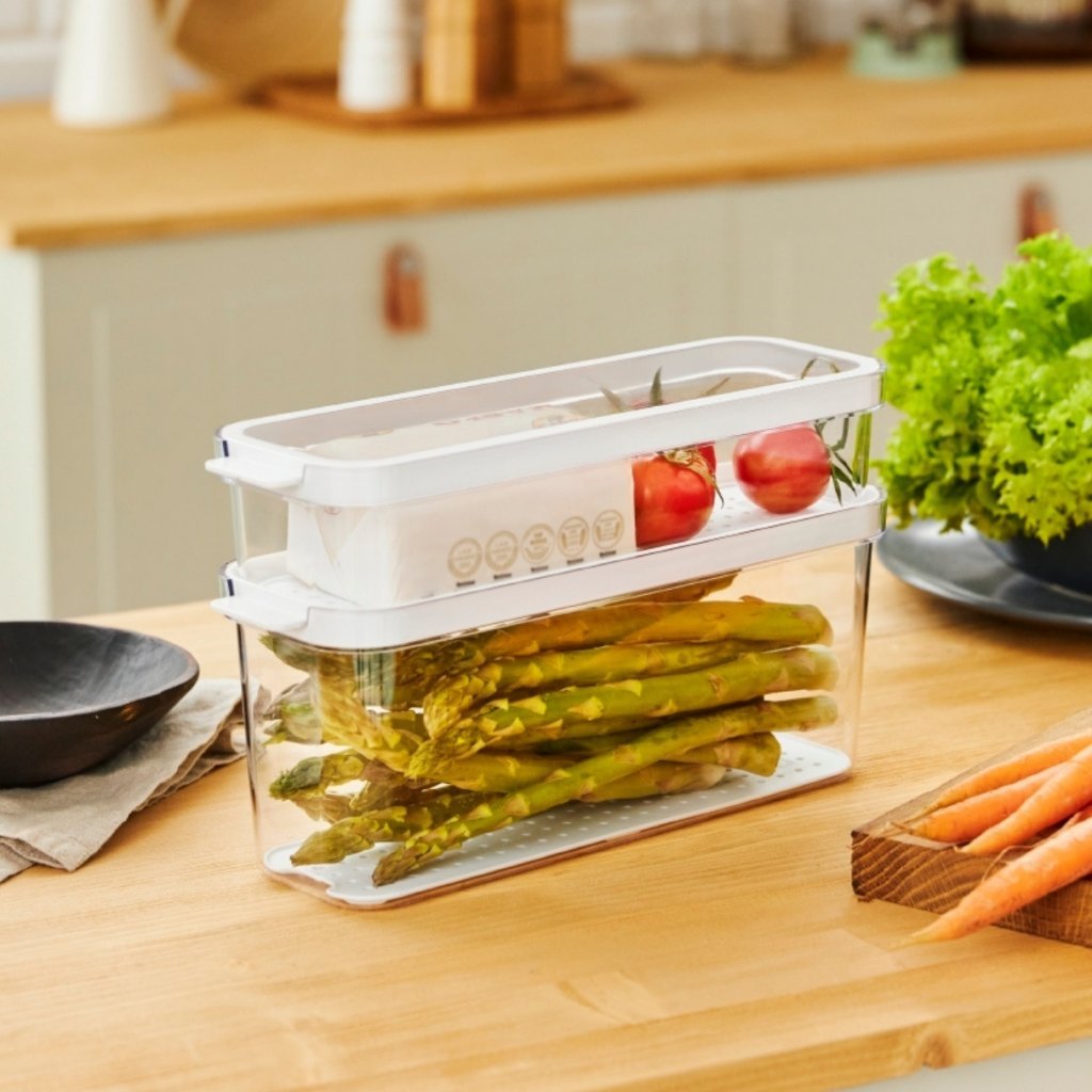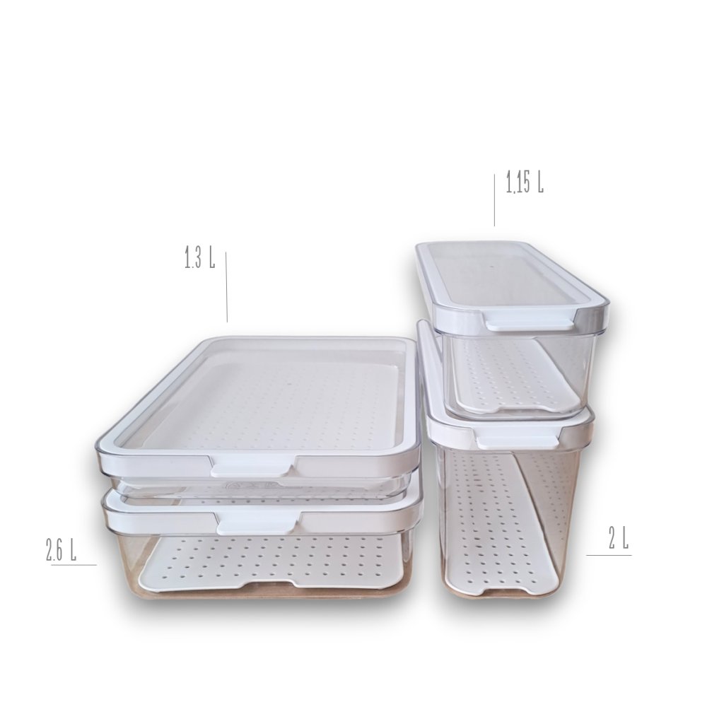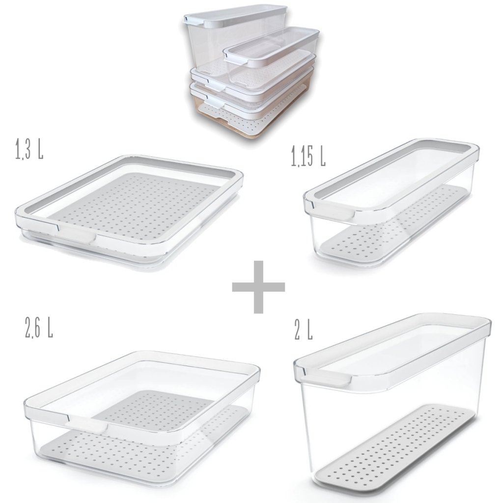 Chcete mať v chladničke poriadok, viac miesta a potraviny dlhšie čerstvé? Súprava organizérov CAUMA prináša premyslený systém, ktorý uľahčí každodenné skladovanie a pomôže vám minimalizovať plytvanie jedlom. Každá nádoba je vybavená vekom a vyberateľnou podložkou, ktorá zabraňuje kontaktu potravín s vlhkosťou a podporuje cirkuláciu vzduchu.