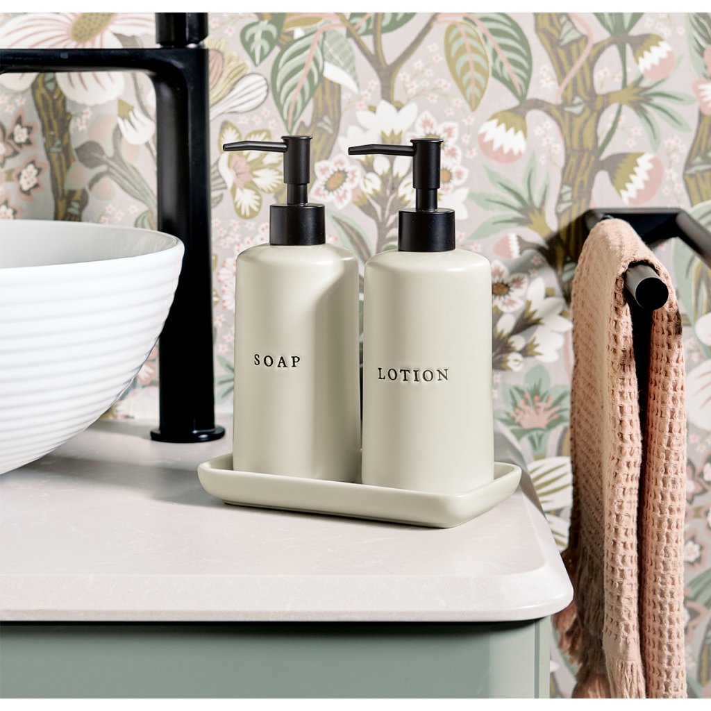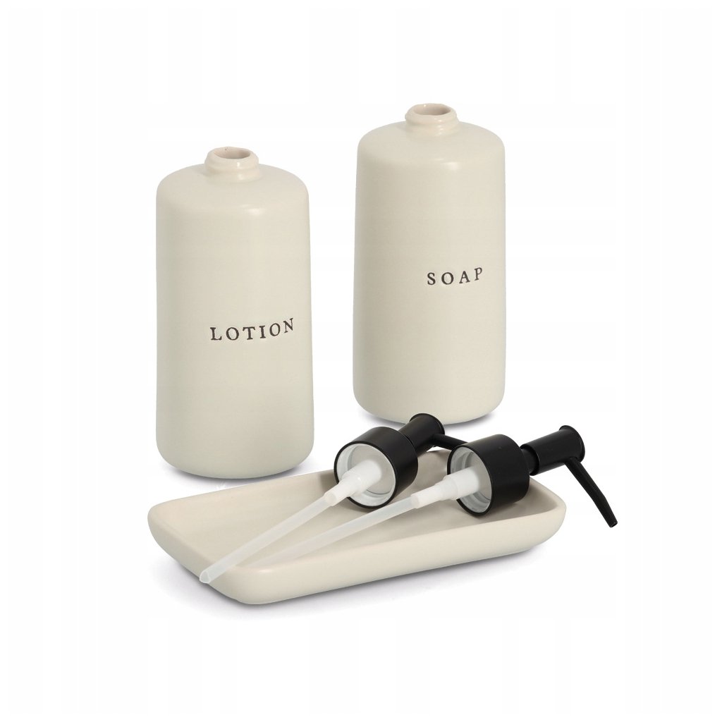 Táto keramická súprava dávkovačov od značky Zeller spája dizajn, praktickosť a funkčnosť. Dva béžové dávkovače s označením "SOAP" a "LOTION" prehľadne rozlíšia obsah a pomôžu vám v každodennej starostlivosti o ruky aj telo.