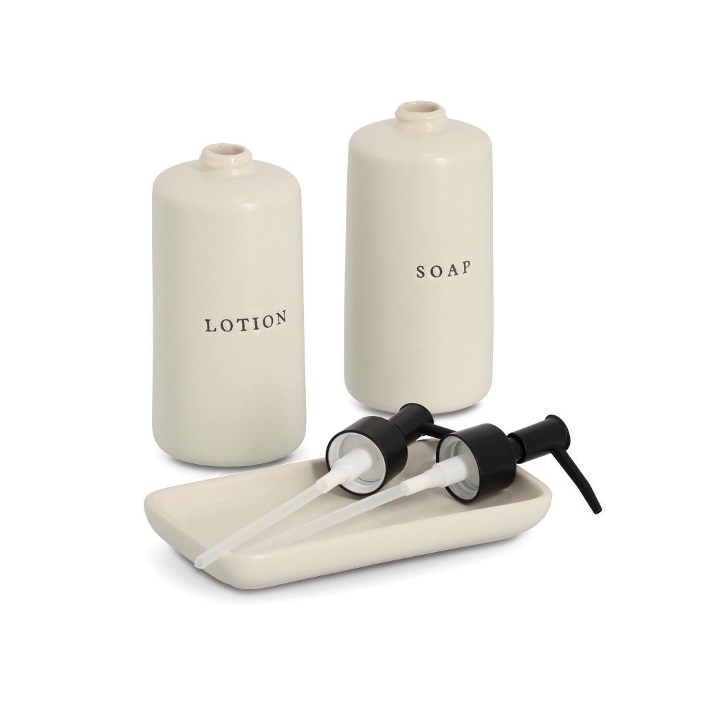 KERAMICKÁ SÚPRAVA DÁVKOVAČOV NA MYDLO A TELOVÉ MLIEKO S PODNOSOM