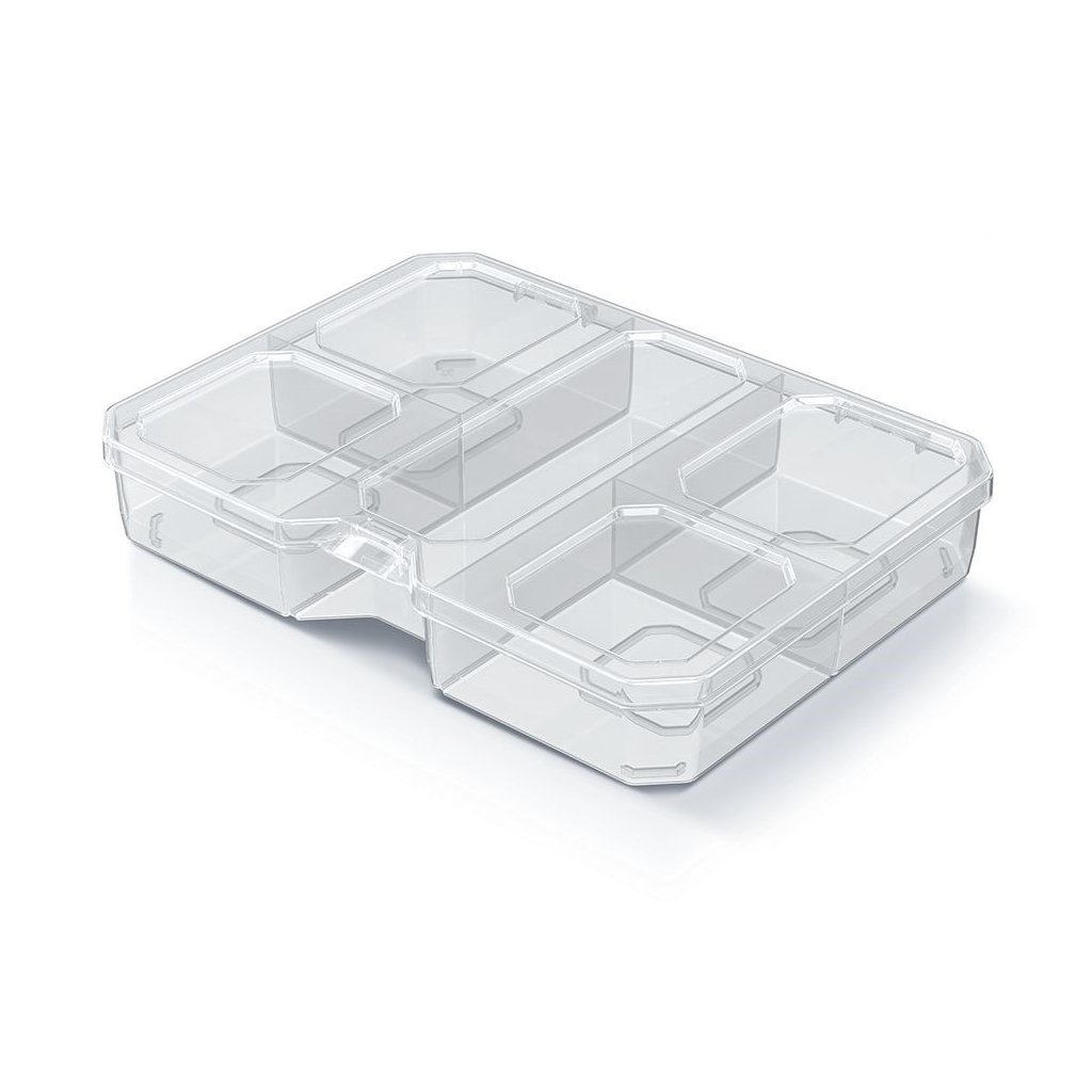 Tento praktický organizér s 5 priehradkami je ideálnym riešením na uloženie kancelárskych potrieb, šijacích doplnkov, šperkov, kozmetiky alebo iných drobností. Hodí sa do detskej izby na LEGO kocky, do dielne na skrutky a spojovací materiál, alebo napríklad do kúpeľne na gumičky, sponky a ďalšie doplnky. Vďaka priehľadnému dizajnu budete mať okamžitý prehľad o obsahu boxu, čo uľahčí organizáciu aj rýchle hľadanie potrebných vecí.