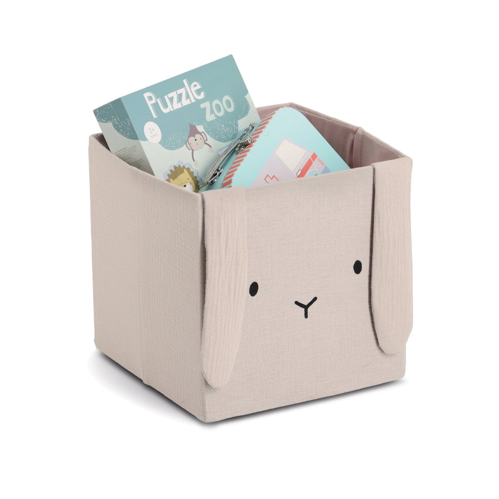 Tento textilný box z mušelínu s uškami si deti zamilujú! Vďaka mäkkému materiálu je vhodný aj pre menšie deti a perfektne sadne do obľúbených políc Kallax. Ideálny pre hračky, plyšáky, knihy aj poklady malých dobrodruhov.