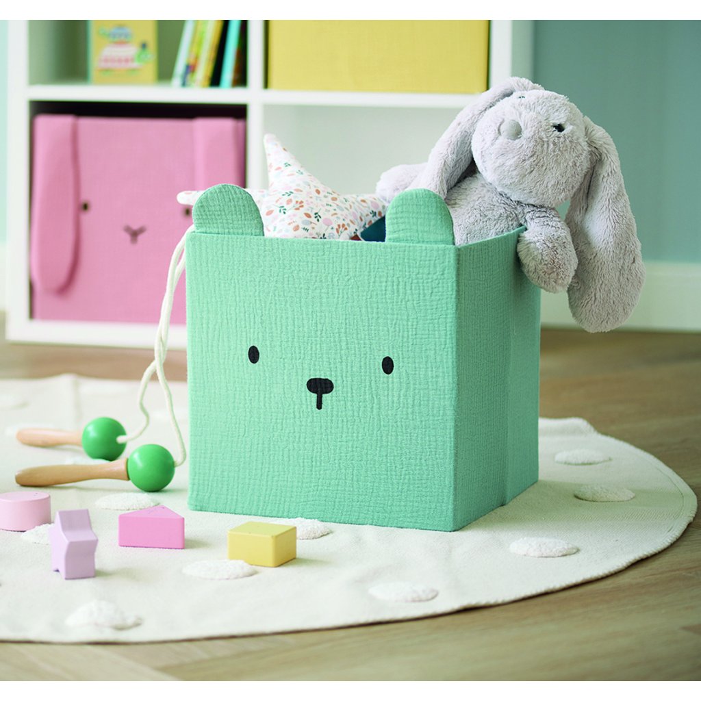 Tento textilný box z mušelínu s uškami si deti zamilujú! Vďaka mäkkému materiálu je vhodný aj pre menšie deti a perfektne sadne do obľúbených políc Kallax. Ideálny pre hračky, plyšáky, knihy aj poklady malých dobrodruhov.