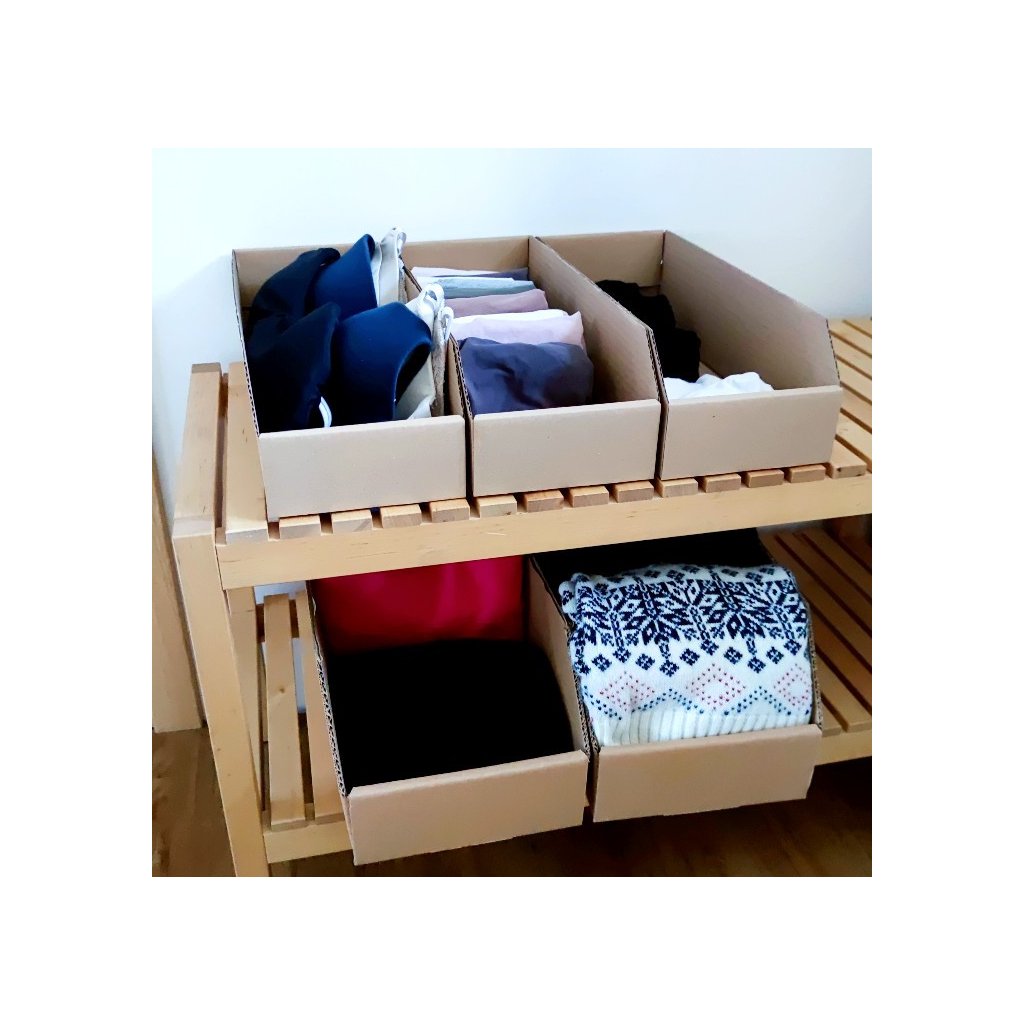 Efektívna organizácia v štýle Marie Kondo! Zabudnite na chaos v šatníku a vytvorte si praktický a prehľadný priestor s našimi ekologickými úložnými boxami. Vďaka premyslenému dizajnu premenia tieto boxy vaše neprehľadné police na systém zásuviek, kde budete mať každý kúsok oblečenia na dosah ruky. Už žiadne zabudnuté spodné vrstvy alebo oblečenie pokrčené v kúte!