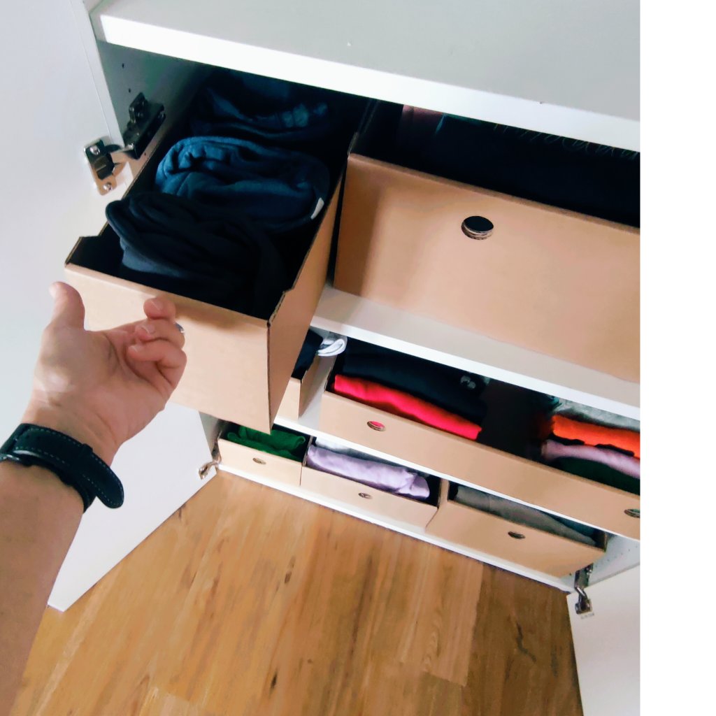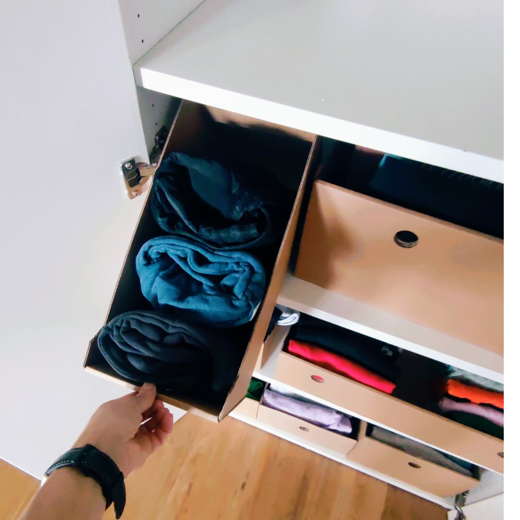 Kartónové boxy nie sú určené len pre šatníkové skrine. Skvele sa hodia do hlbokých skríň na potraviny, náradie, hračky alebo napríklad kreatívne potreby. Sú ideálne do políc aj zásuviek a umožňujú prehľadné usporiadanie čohokoľvek.