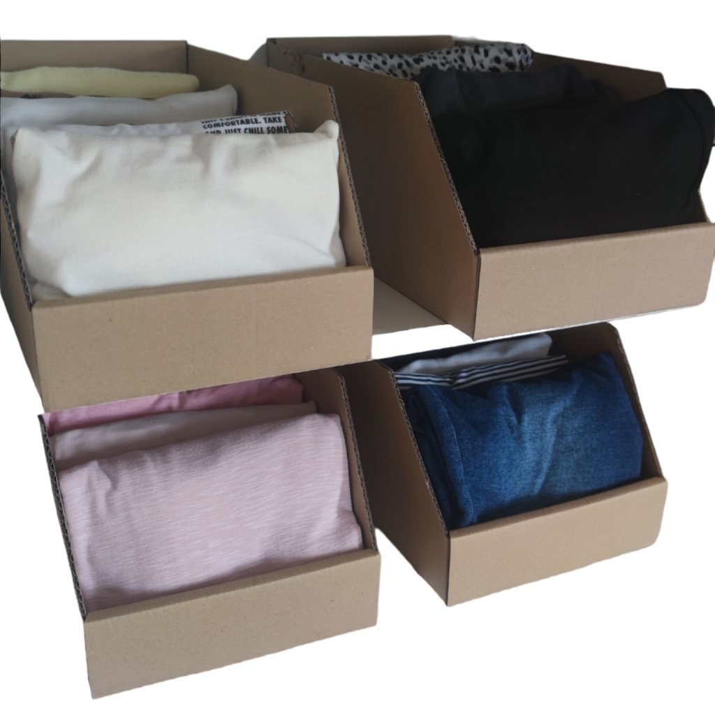 - Jednoduché roztriedenie oblečenia: Boxy premenia vaše police na prehľadný zásuvkový systém, vďaka ktorému už nikdy nebudete tápať, kam čo patrí.