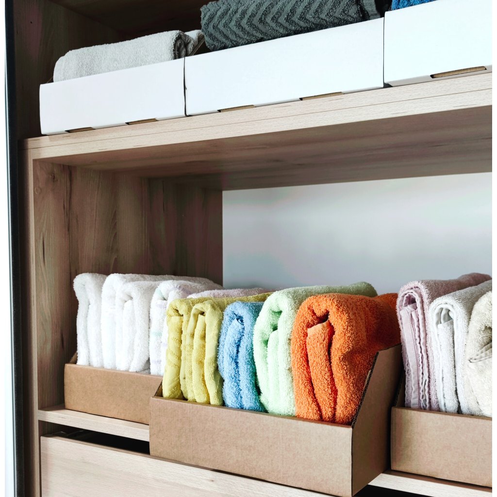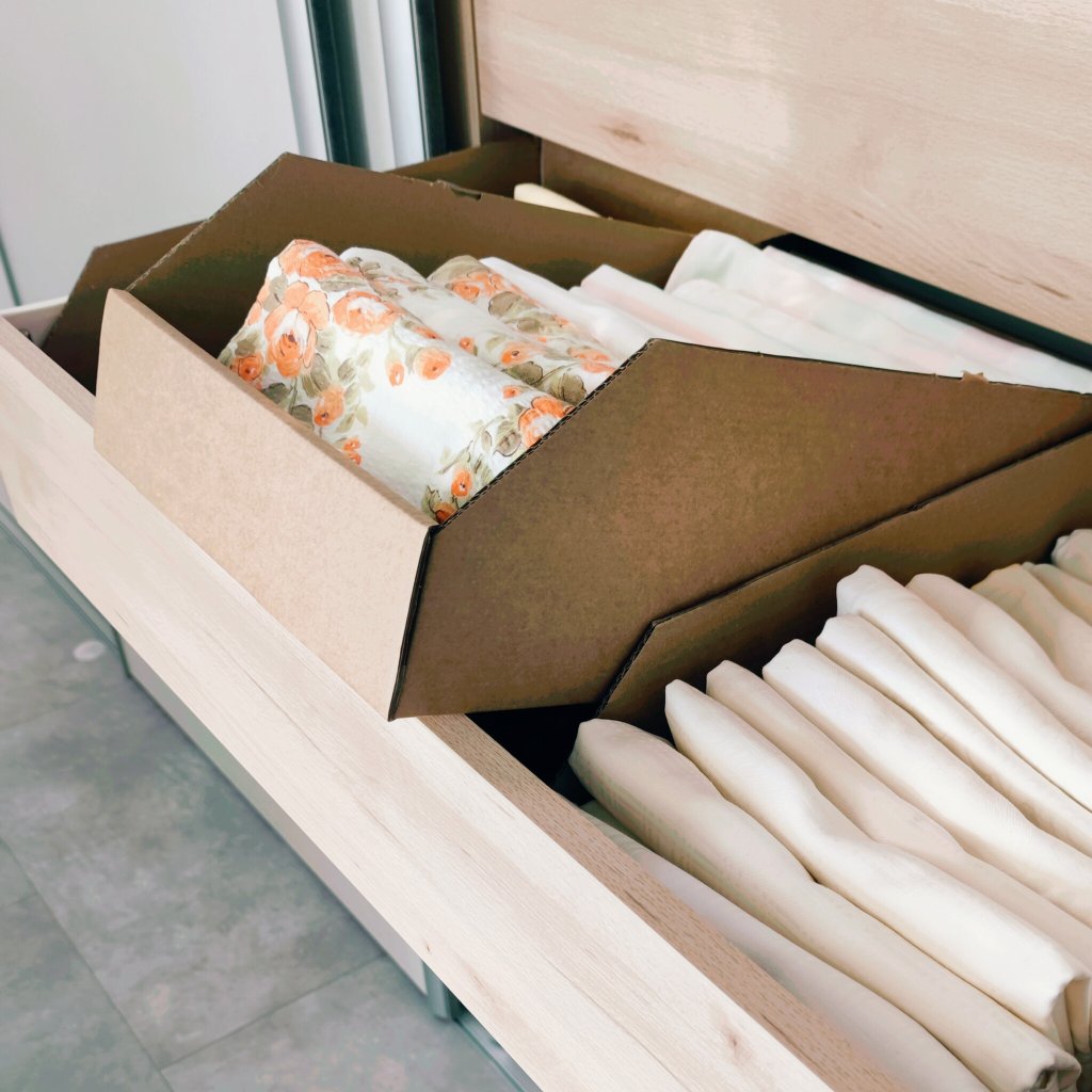 Každá skriňa môže skrývať problémy s neefektívnym využitím priestoru, hlbokými policami a nepraktickým „komínkovaním“ oblečenia do niekoľkých vrstiev, čo vedie k neporiadku a zabúdaniu na spodné vrstvy oblečenia. S našimi kartónovými úložnými boxmi môžete vytvoriť prehľadný systém ukladania podobný zásuvkám, vďaka čomu bude váš šatník dokonale organizovaný.