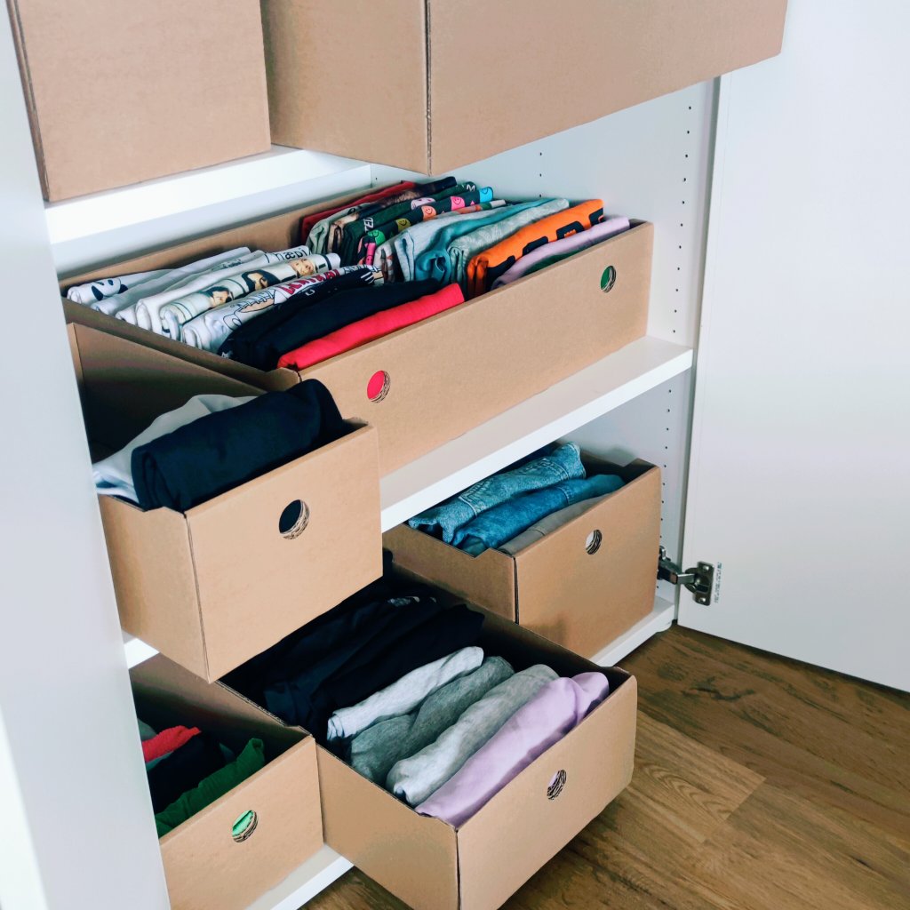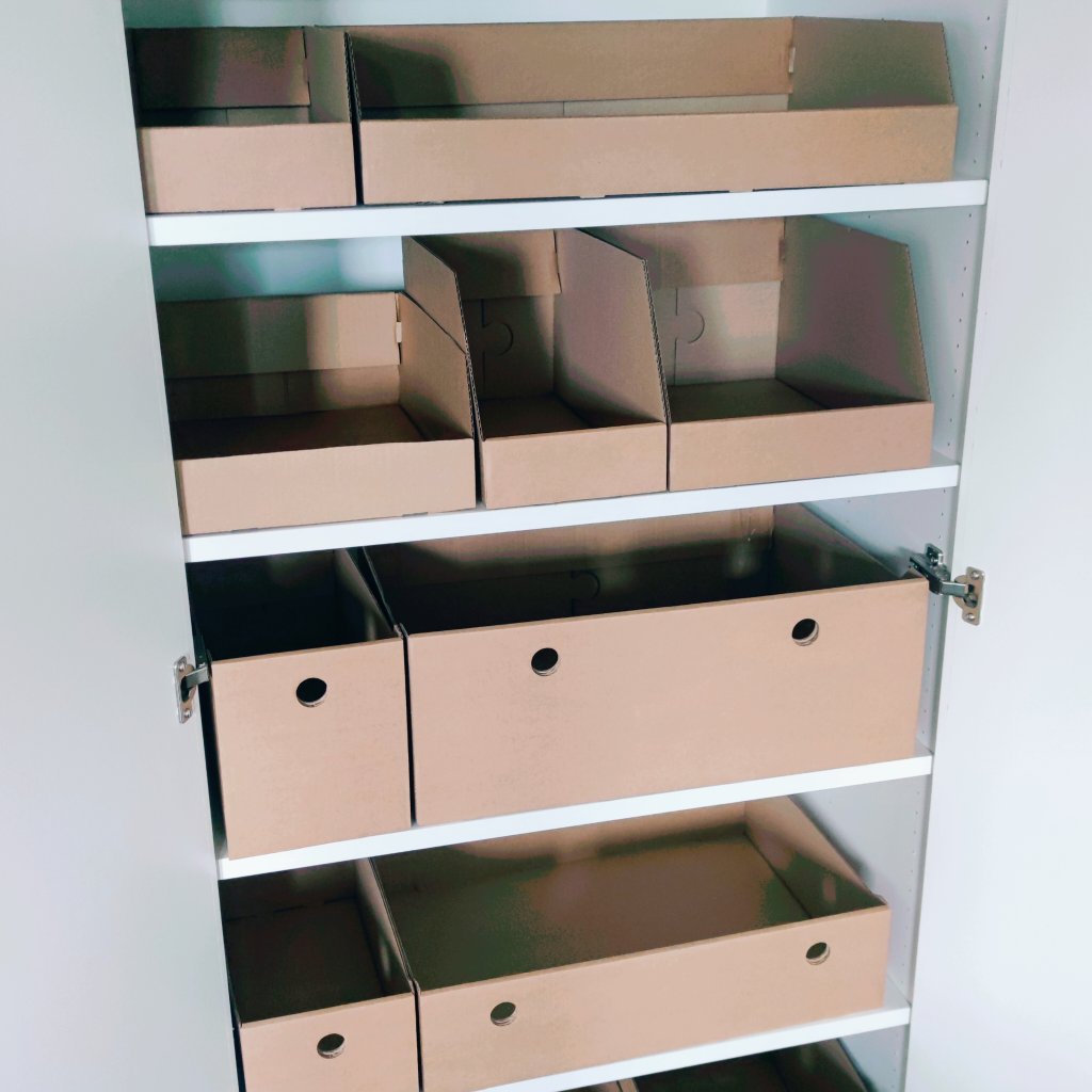 Organizér stavia na jednoduchosti, praktickosti a ekologickom dopade, preto sme nechali vyrobiť boxy z pevného trojitého kartónu. Je navrhnutý priamo na zákazku podľa našich predstáv a pre efektívne uloženie. Univerzálny box sa ale hodí aj do každej inej hlbokej skrine, kde ukladáte potraviny, náradie, hračky, kreatívne potreby, proste čokoľvek potrebujete prehľadne usporiadať a zorganizovať.