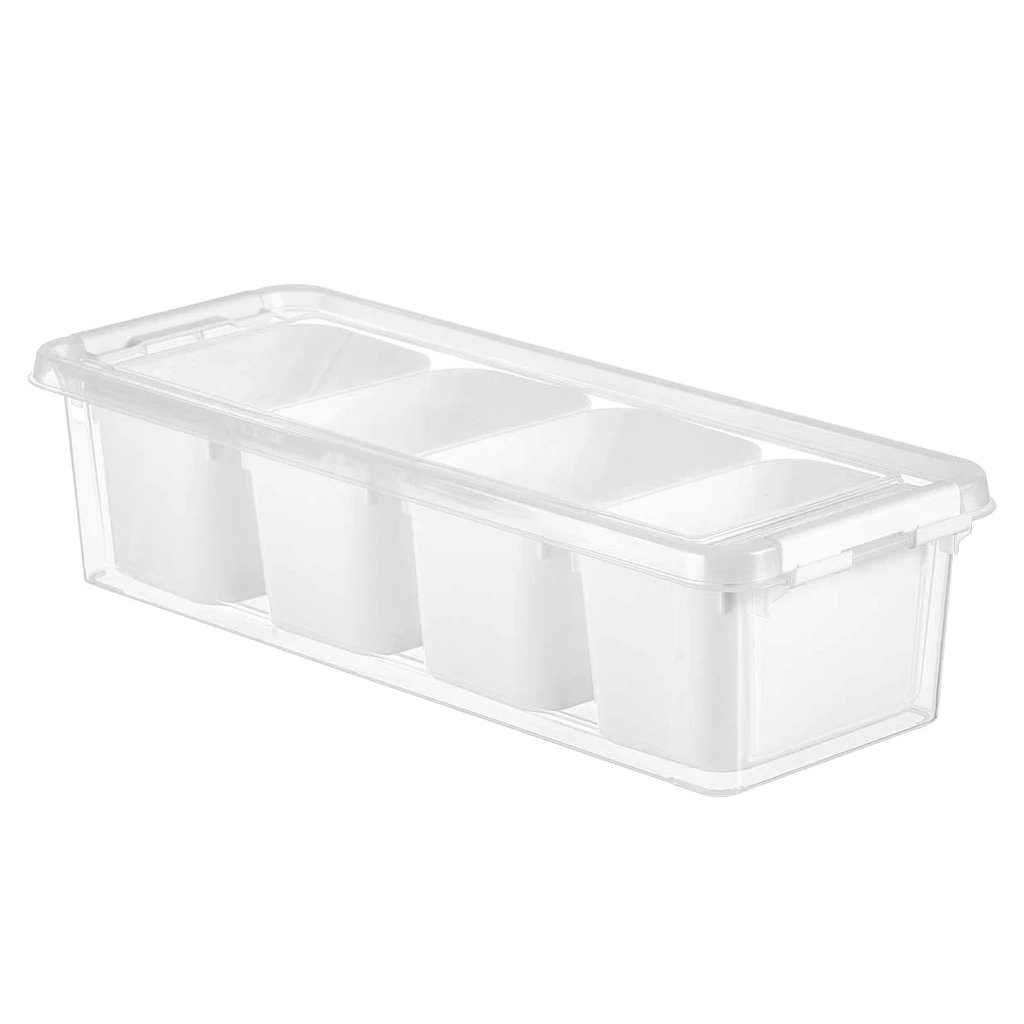 Štýlový a funkčný organizér môže byť vhodný do chladničky na zeleninu alebo drobné ovocie, ale aj na čajové vrecúška. Pomôže vám udržať poriadok v kuchyni a zaistí jednoduché rozdelenie na 4 časti. Vďaka 4 odnímateľným boxom si môžete prispôsobiť úložný priestor podľa vlastných potrieb. Priehľadný dizajn umožňuje rýchly prehľad o obsahu, zatiaľ čo stohovateľná konštrukcia šetrí miesto v kuchynských skrinkách.